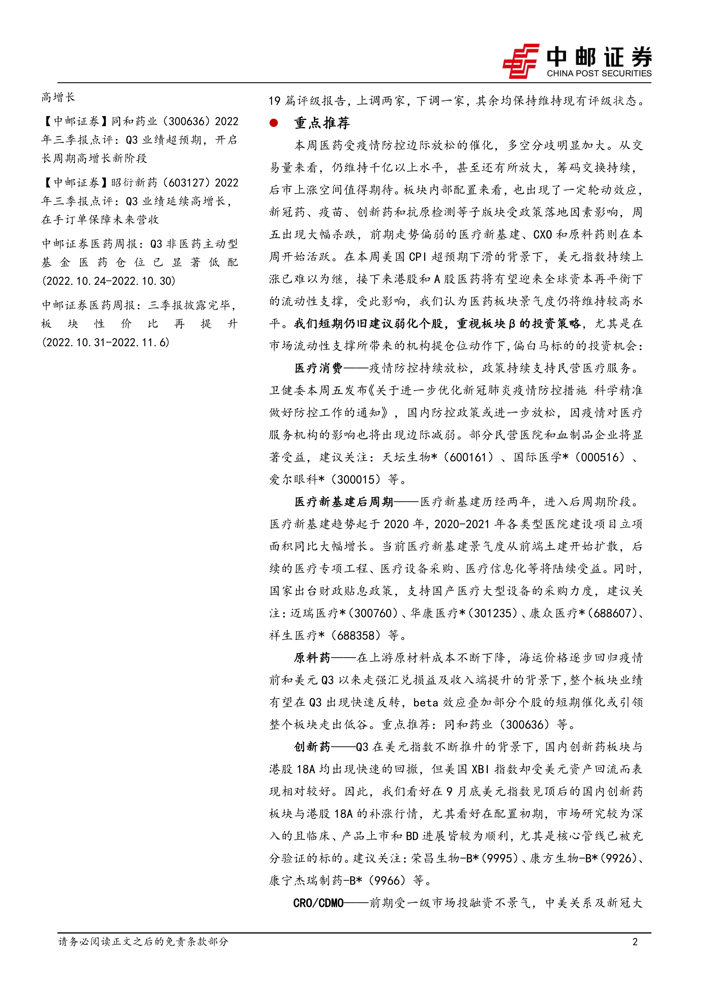 CRO/CDMO——前期受一级市场投融资不景气,中美关系及新冠大订单等多因素扰动,整体医药外包板块估值出现快速回撤,但相信随着行业内部分优质公司业绩不断兑现,以及近期海外部分CRO企业全年业绩指引上调等事件催化,板块有望迎来估值与业绩双升。建议关注:昭衍新药(603127)、药明康德*(603259)、泰格医药*(300347)等。(其中,标注*的暂未深度覆盖)