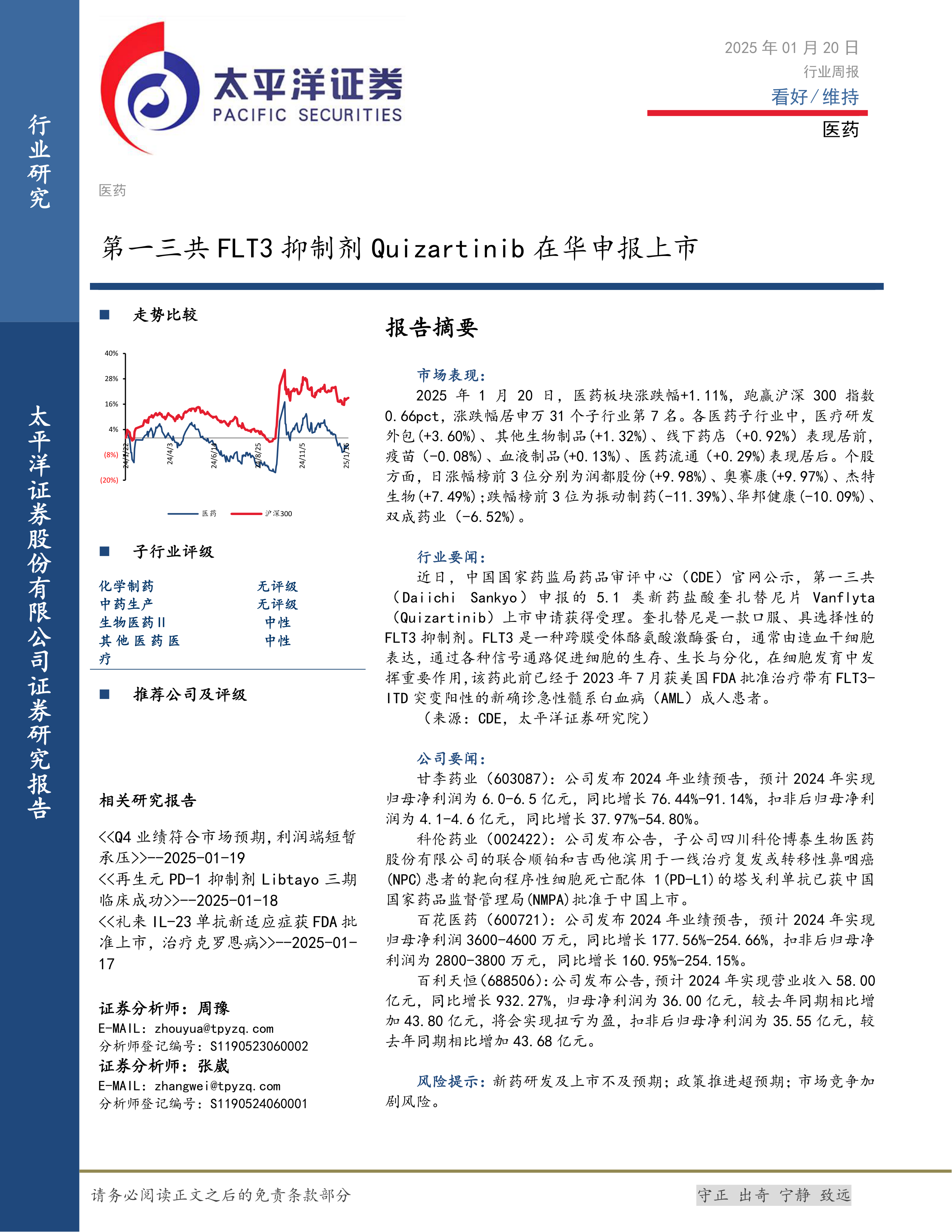 本周医药板块整体表现良好,创新药的研发进展和重点公司的业绩增长是关注焦点。第一三共FLT3抑制剂在华申报上市,以及科伦药业PD-L1单抗获批上市,都表明创新药领域持续活跃。甘李药业、百花医药和百利天恒的业绩预告均显示出良好的增长态势。投资者应关注新药研发进展、政策推进以及市场竞争风险,把握医药行业的投资机会。