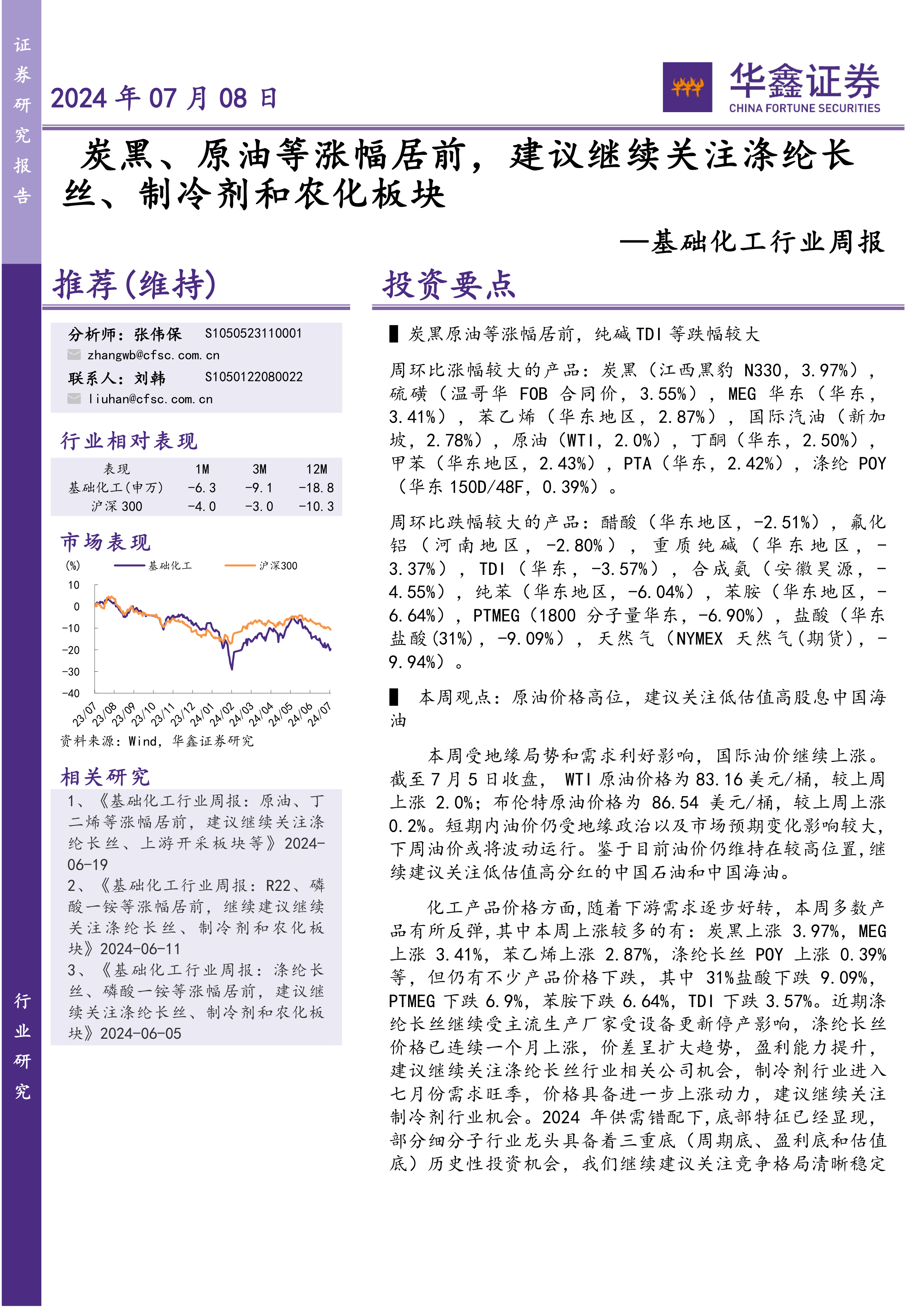 基础化工行业周报:炭黑、原油等涨幅居前,建议继续关注涤纶长丝、制冷剂和农化板块