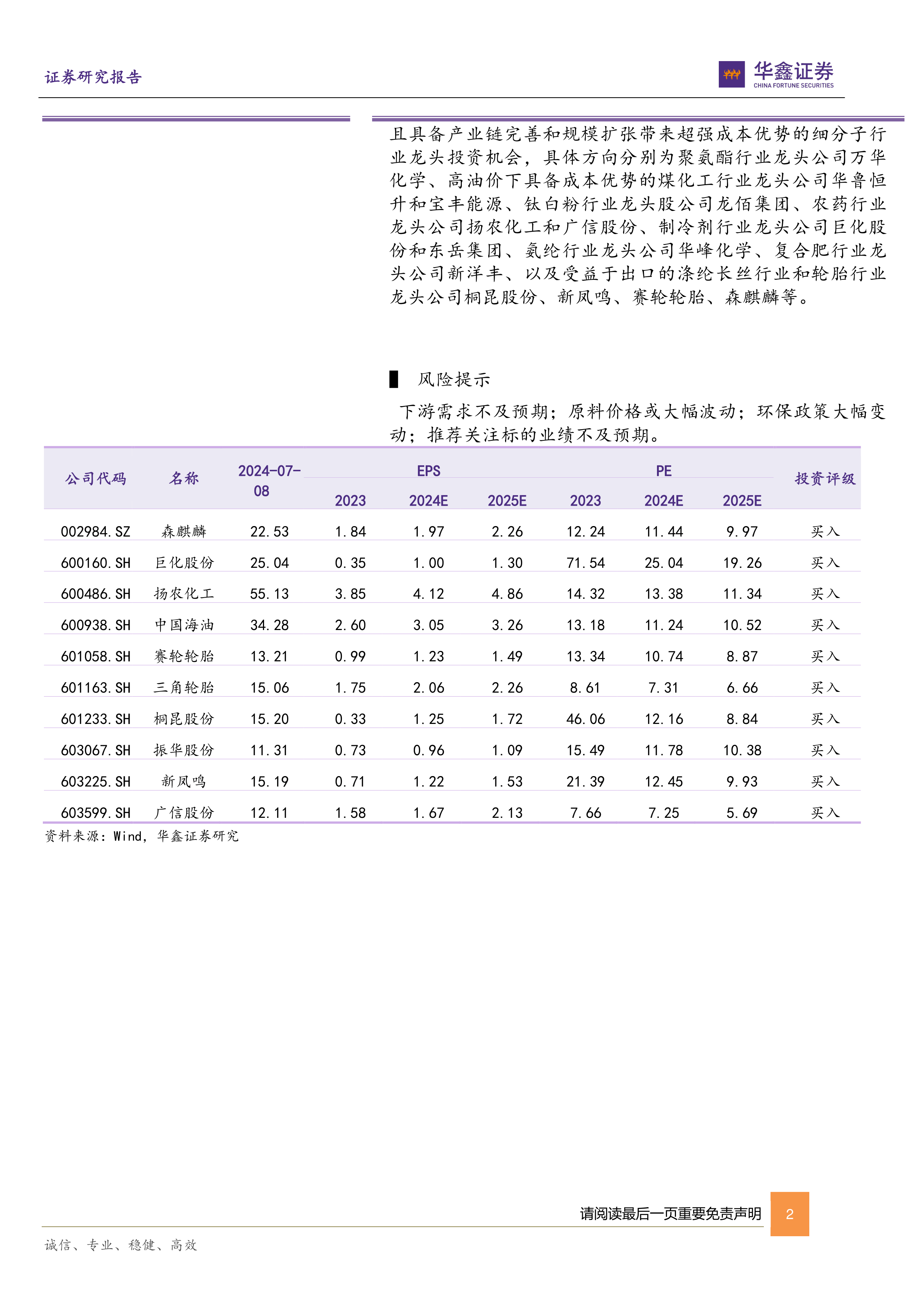 在当前市场环境下,报告明确指出多个细分领域的投资机会。在聚氨酯行业,推荐关注龙头公司万华化学;在高油价背景下,具备成本优势的煤化工行业龙头华鲁恒升和宝丰能源值得关注;钛白粉行业龙头龙佰集团、农药行业龙头扬农化工和广信股份、制冷剂行业龙头巨化股份和东岳集团、氨纶行业龙头华峰化学、复合肥行业龙头新洋丰,以及受益于出口的涤纶长丝行业和轮胎行业龙头桐昆股份、新凤鸣、赛轮轮胎、森麒麟等均被列为重点推荐标的。