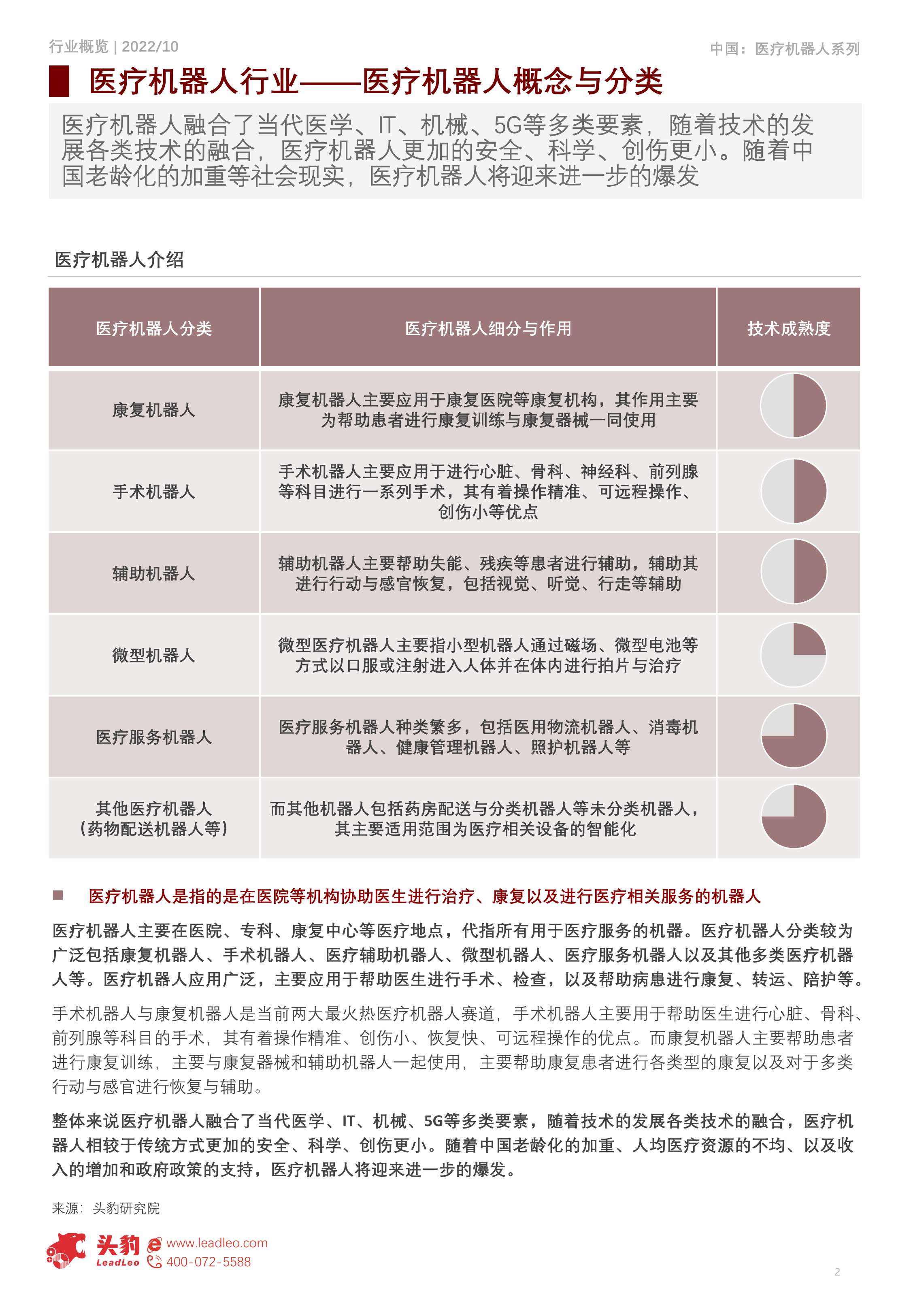 医疗机器人融合了当代医学、IT、机械、5G等多类要素,随着技术的发展各类技术的融合,医疗机器人更加的安全、科学、创伤更小。随着中国老龄化的加重等社会现实,医疗机器人将迎来进一步的爆发