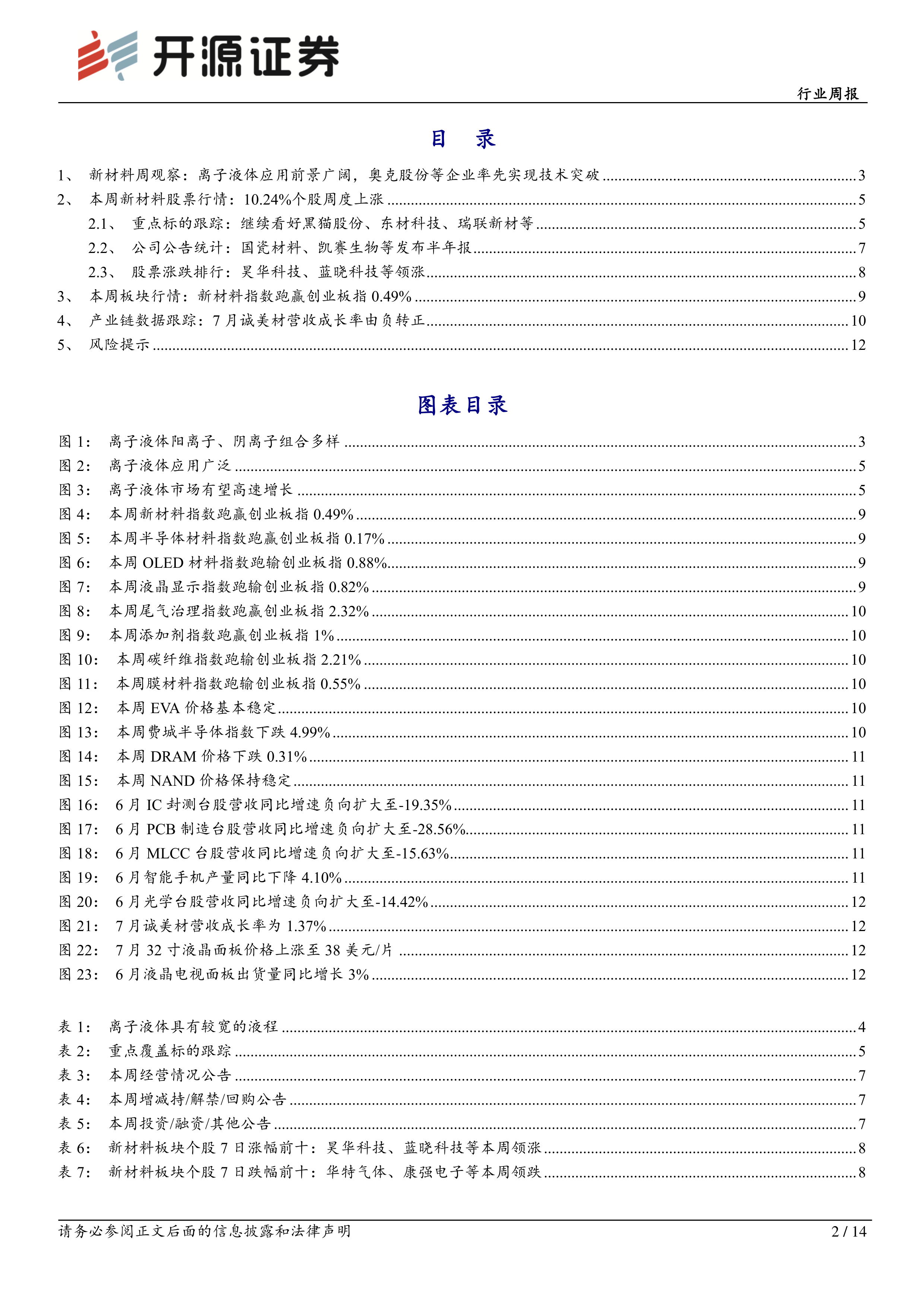 新材料行业周报:离子液体应用前景广阔,国瓷材料等发布半年报