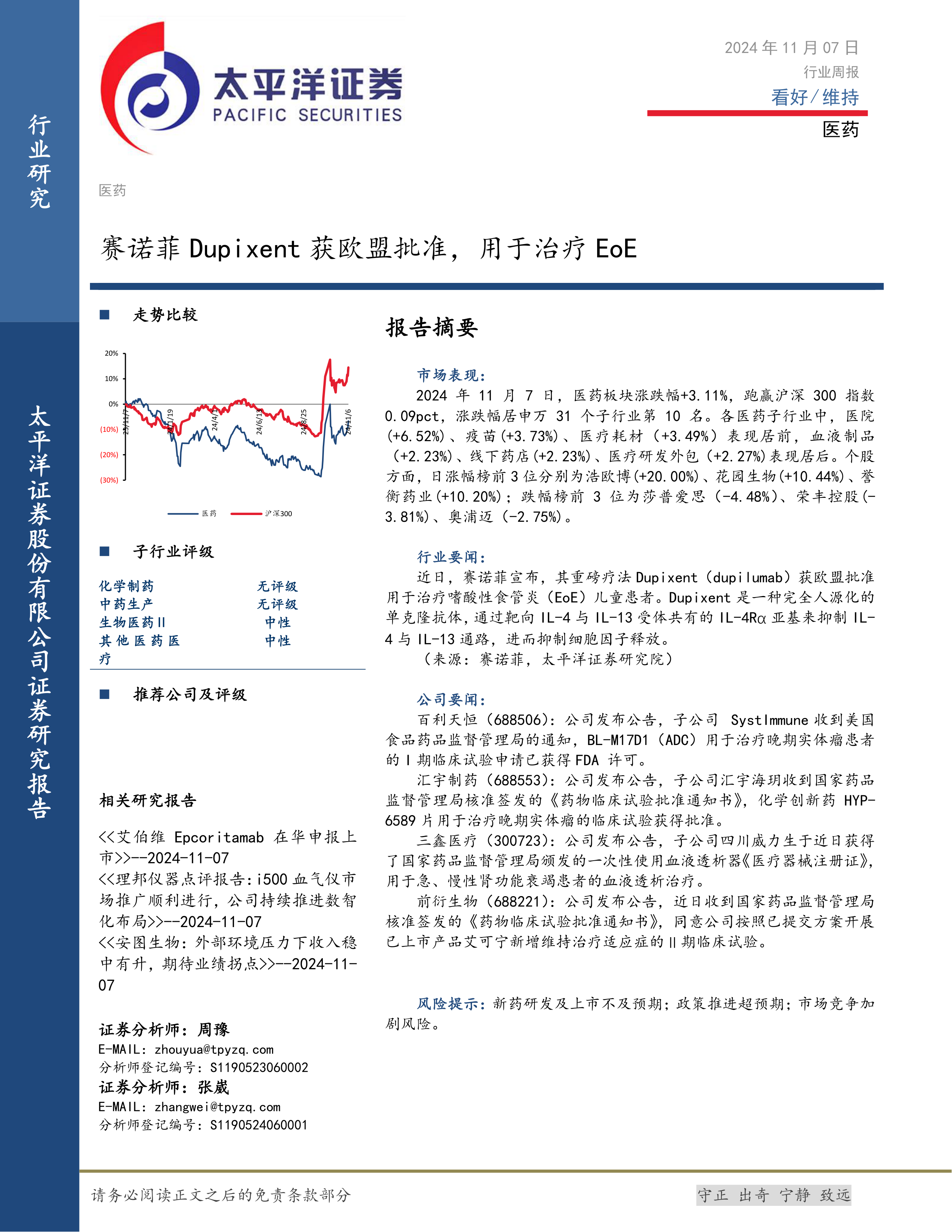本周医药行业整体表现积极,市场涨幅领先,显示出较强的韧性和增长潜力。在市场表现方面,医药板块跑赢沪深300指数,疫苗和医疗耗材子行业表现突出。行业要闻方面,赛诺菲的重磅药物Dupixent获欧盟批准,凸显了生物制药领域的创新活力。同时,多家国内医药公司在创新药临床试验和医疗器械注册方面取得重要进展,为未来的业绩增长奠定了基础。尽管新药研发、政策变化和市场竞争等风险依然存在,但整体而言,医药行业在创新驱动下保持了良好的发展势头。