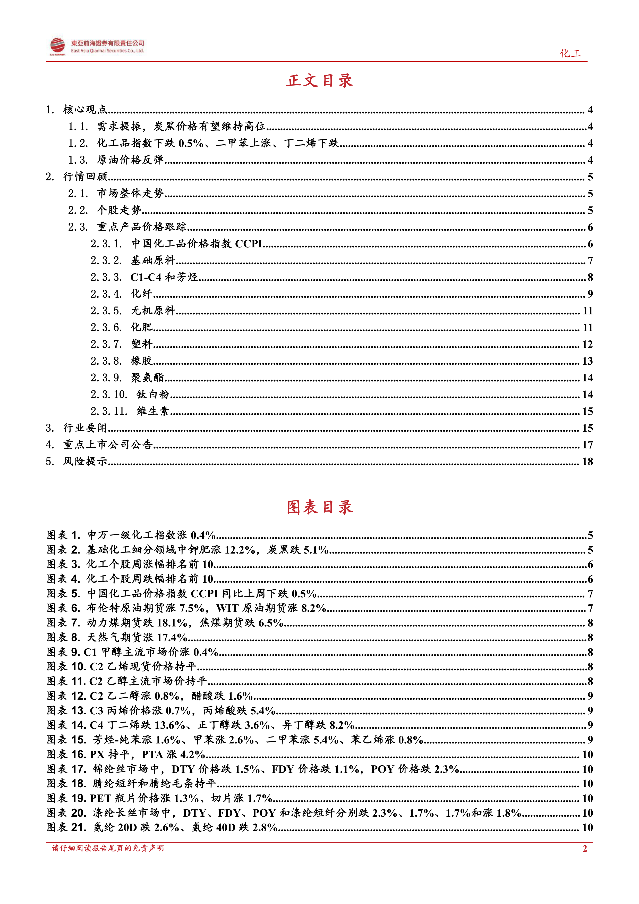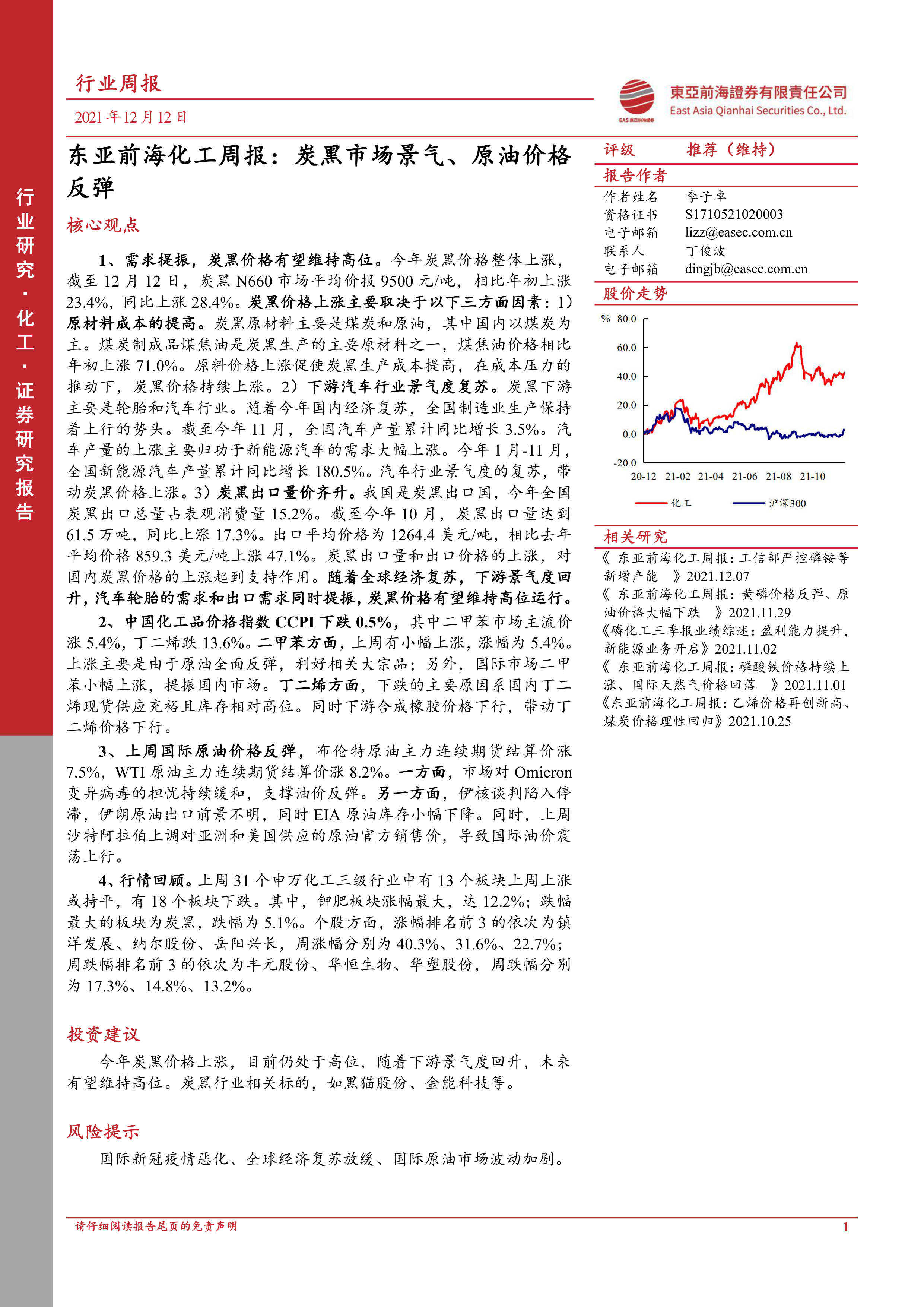 1、 需求提振, 炭黑价格有望维持高位。 今年炭黑价格整体上涨,截至 12 月 12 日, 炭黑 N660 市场平均价报 9500 元/吨, 相比年初上涨23.4%, 同比上涨 28.4%。 炭黑价格上涨主要取决于以下三方面因素: 1)原材料成本的提高。 炭黑原材料主要是煤炭和原油, 其中国内以煤炭为主。 煤炭制成品煤焦油是炭黑生产的主要原材料之一, 煤焦油价格相比年初上涨 71.0%。 原料价格上涨促使炭黑生产成本提高, 在成本压力的推动下, 炭黑价格持续上涨。 2) 下游汽车行业景气度复苏。 炭黑下游主要是轮胎和汽车行业。 随着今年国内经济复苏, 全国制造业生产保持着上行的势头。 截至今年 11 月, 全国汽车产量累计同比增长 3.5%。 汽车产量的上涨主要归功于新能源汽车的需求大幅上涨。 今年 1 月-11 月,全国新能源汽车产量累计同比增长 180.5%。 汽车行业景气度的复苏, 带动炭黑价格上涨。 3) 炭黑出口量价齐升。 我国是炭黑出口国, 今年全国炭黑出口总量占表观消费量 15.2%。 截至今年 10 月, 炭黑出口量达到61.5 万吨, 同比上涨 17.3%。 出口平均价格为 1264.4 美元/吨, 相比去年平均价格 859.3 美元/吨上涨 47.1%。 炭黑出口量和出口价格的上涨, 对国内炭黑价格的上涨起到支持作用。 随着全球经济复苏, 下游景气度回升, 汽车轮胎的需求和出口需求同时提振, 炭黑价格有望维持高位运行。
