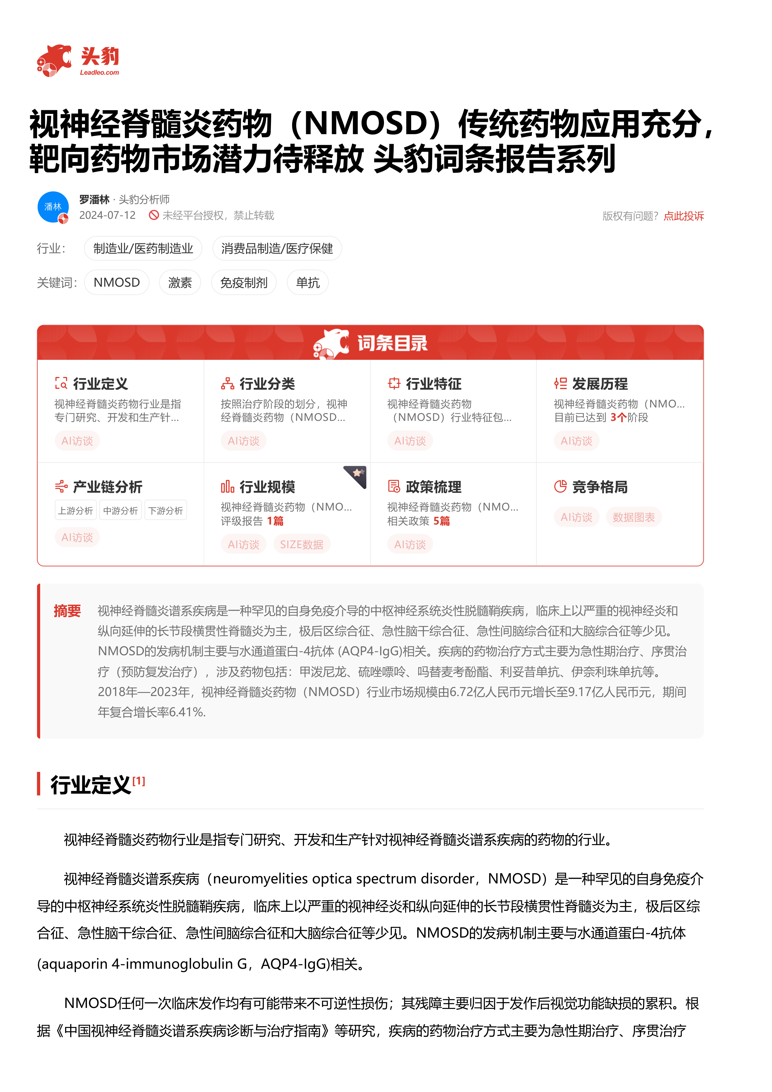 视神经脊髓炎药物(NMOSD):传统药物应用充分,靶向药物市场潜力待释放 头豹词条报告系列