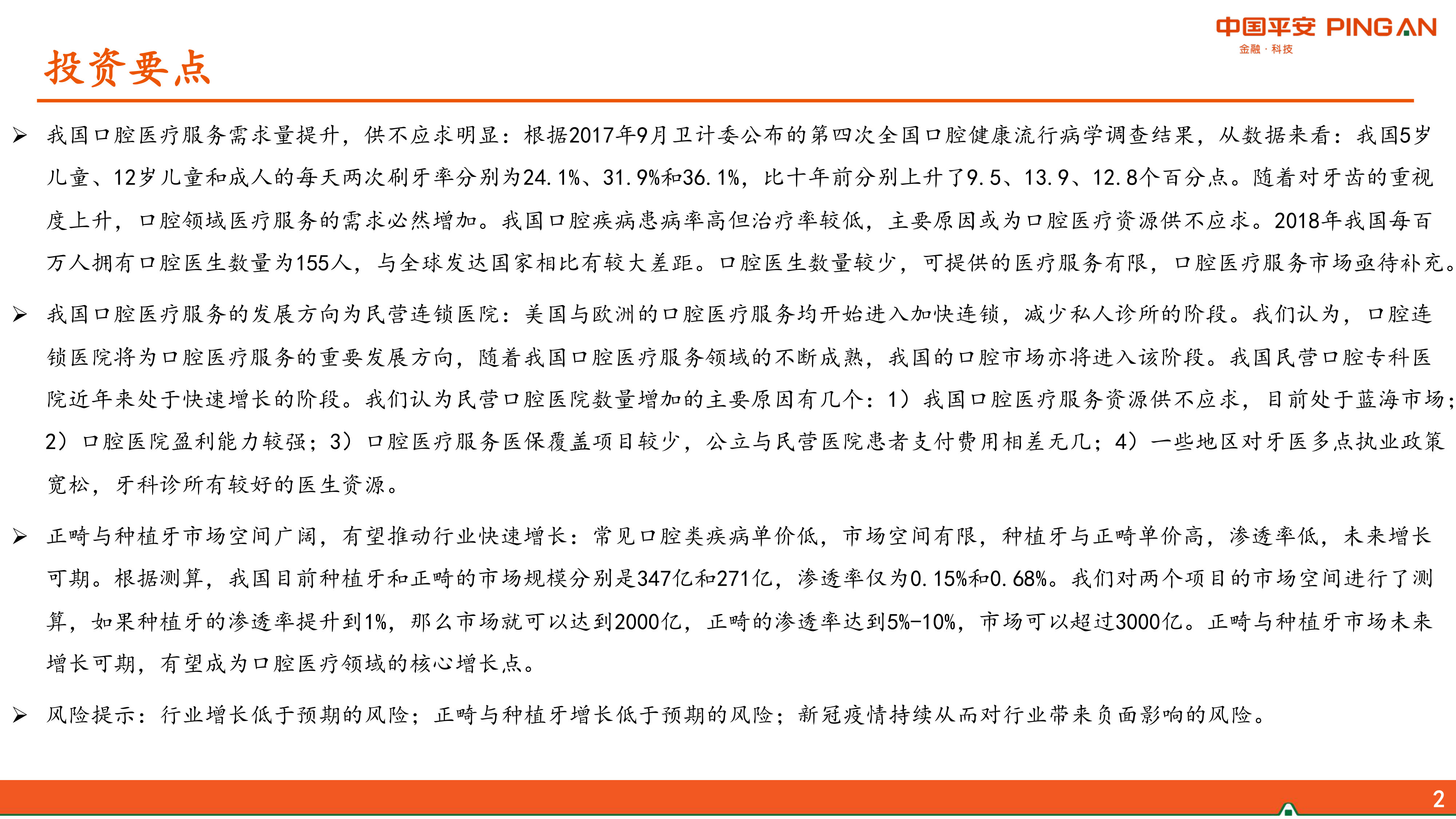 报告强调,民营连锁医院将成为中国口腔医疗服务行业的重要发展方向,借鉴欧美市场经验,连锁化能有效整合资源、提升服务质量并形成规模效应。民营口腔医院的快速增长得益于其盈利能力强、医保覆盖项目少导致公立与民营支付差异小,以及多点执业政策带来的医生资源优势。同时,种植牙和正畸等高价值、低渗透率的医疗项目被视为未来行业增长的核心引擎,其巨大的潜在市场规模(种植牙有望达2000亿元,正畸有望超3000亿元)将显著推动整个口腔医疗服务市场的快速扩张。