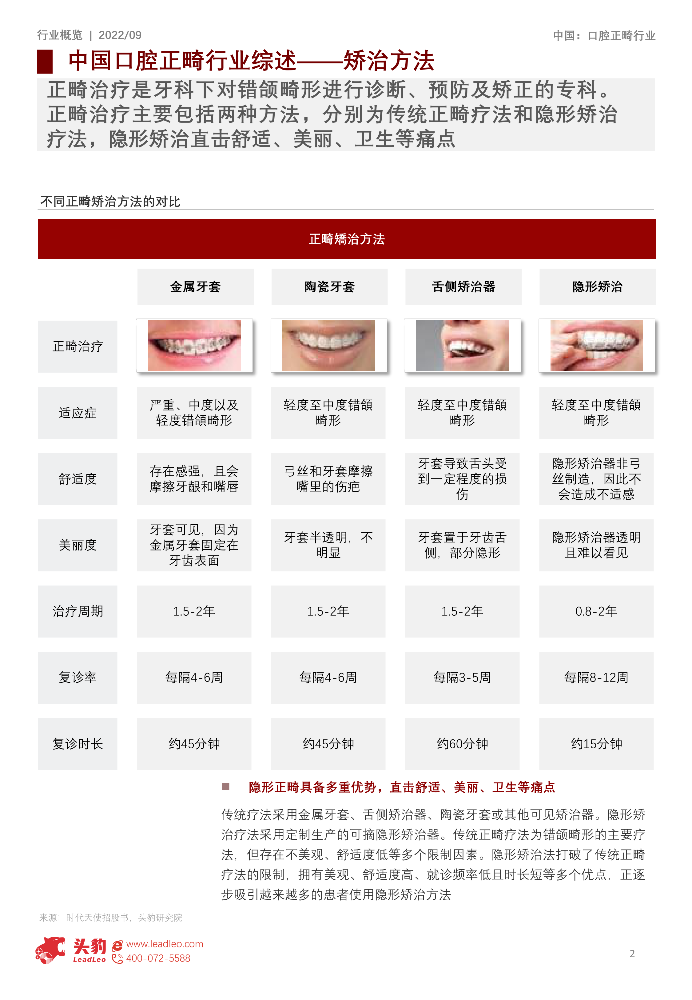 口腔正畸治疗旨在诊断、预防和矫正错颌畸形,主要分为传统正畸疗法和隐形矫治疗法。传统疗法包括金属牙套、陶瓷牙套和舌侧矫治器,虽为主要疗法,但存在不美观、舒适度低等局限。隐形矫治器则通过定制生产的可摘透明矫治器,有效解决了这些痛点,具备美观、舒适度高、就诊频率低(每8-12周复诊一次,每次约15分钟)等优点,正吸引越来越多的患者。例如,隐形矫治器非弓丝制造,不造成不适感,且透明难以看见,治疗周期0.8-2年,复诊率和复诊时长均优于传统方法。