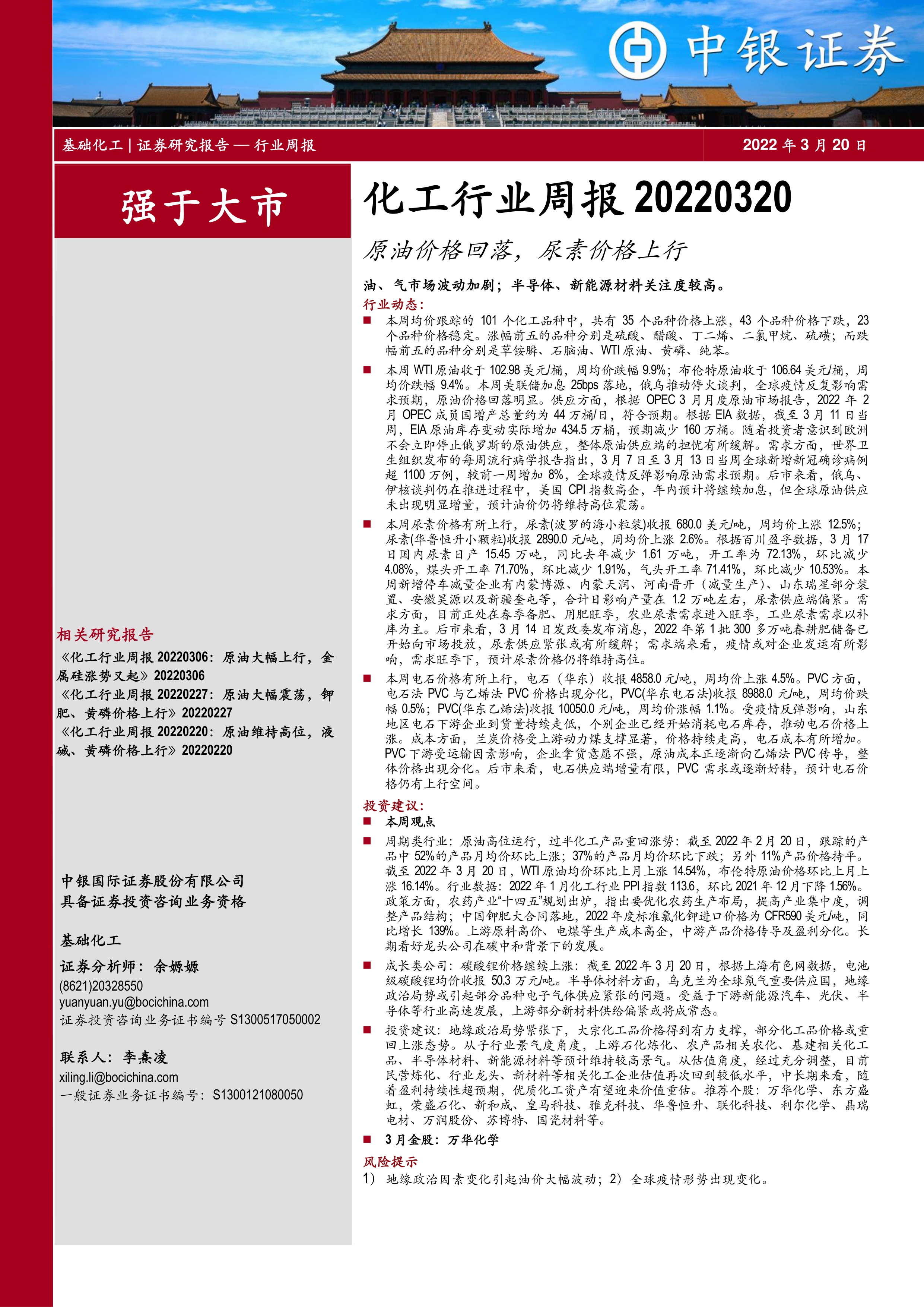本报告深入分析了2022年3月20日当周基础化工行业的市场动态、投资建议及重点企业表现。当前化工市场受地缘政治、全球疫情、宏观经济政策及供需结构等多重因素影响,呈现出复杂且分化的景气格局。原油价格虽有回落但仍维持高位震荡,带动部分大宗化工品价格上行;同时,尿素、电石等特定品种因供需偏紧而价格上涨。在周期性行业中,超过半数化工产品价格重回涨势,而成长性领域如碳酸锂、半导体材料等新材料需求旺盛,供给偏紧成为常态。
