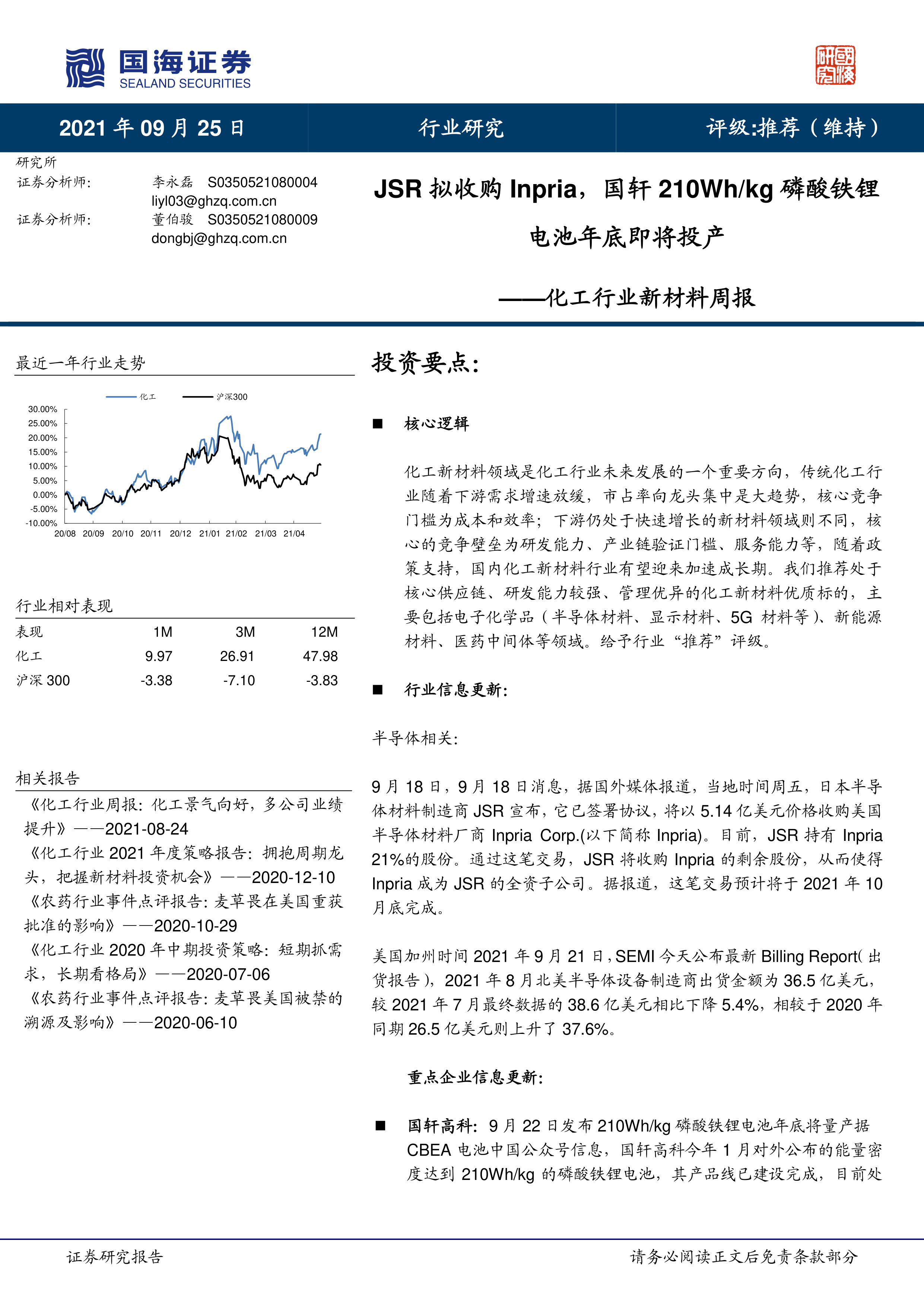 化工行业新材料周报:JSR拟收购Inpria,国轩210Wh/kg磷酸铁锂电池年底即将投产