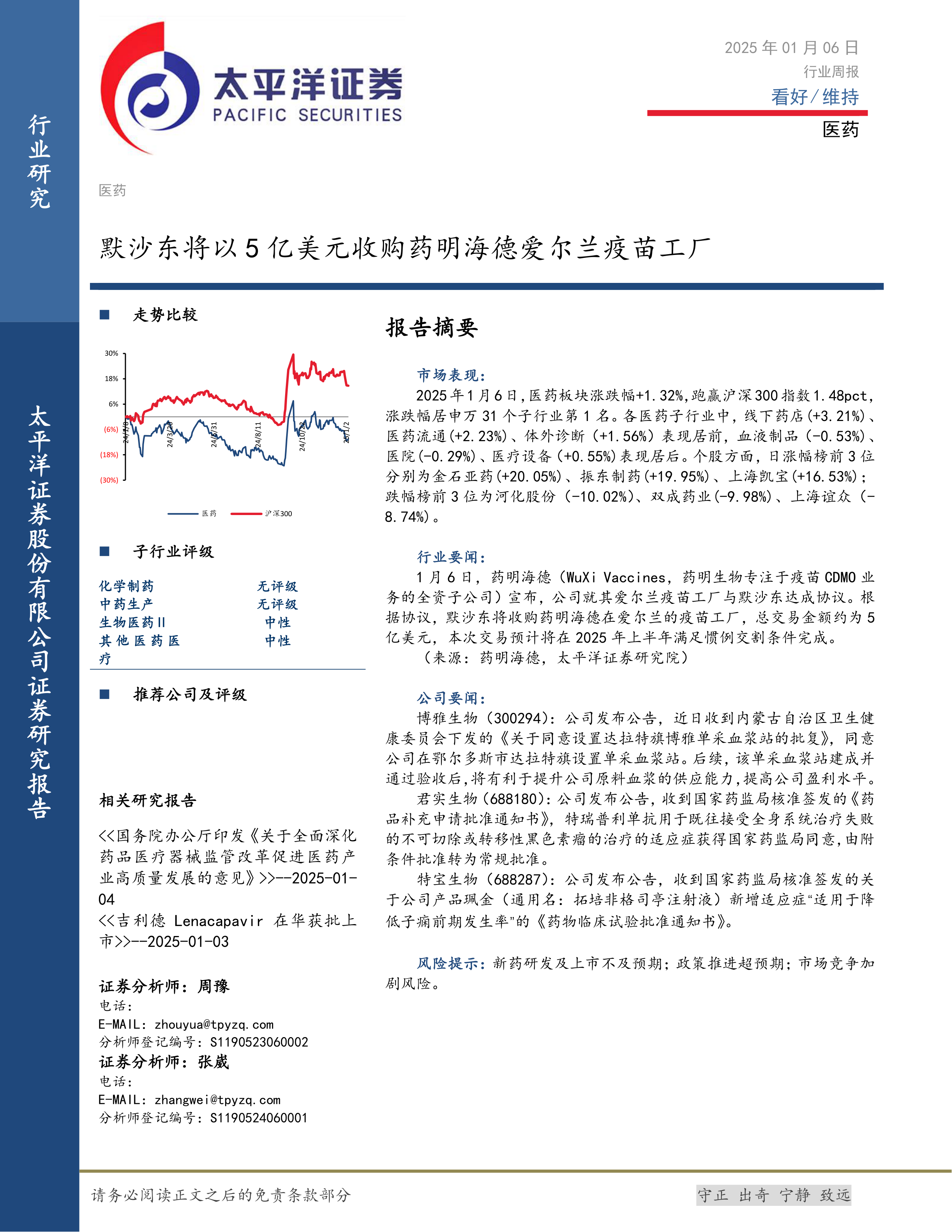 本报告分析了2025年1月6日医药行业的市场表现和重要事件。医药板块整体表现优于大盘,但内部存在分化。默沙东收购药明海德疫苗工厂是行业内的重要事件,而博雅生物、君实生物、特宝生物的公司公告也反映了各自的发展动态。投资者应关注行业内的结构性机会和风险。