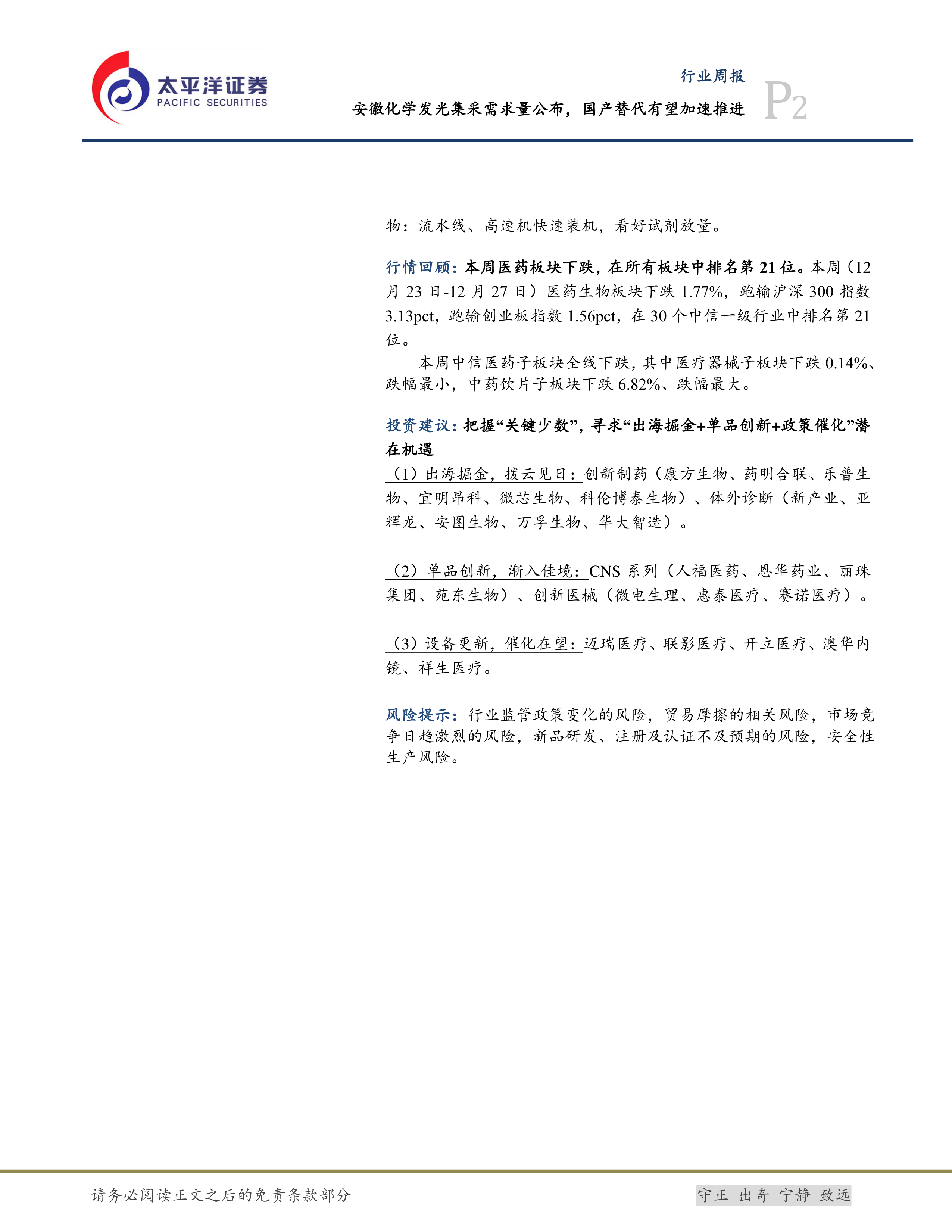 医药行业周报:安徽化学发光集采需求量公布,国产替代有望加速推进