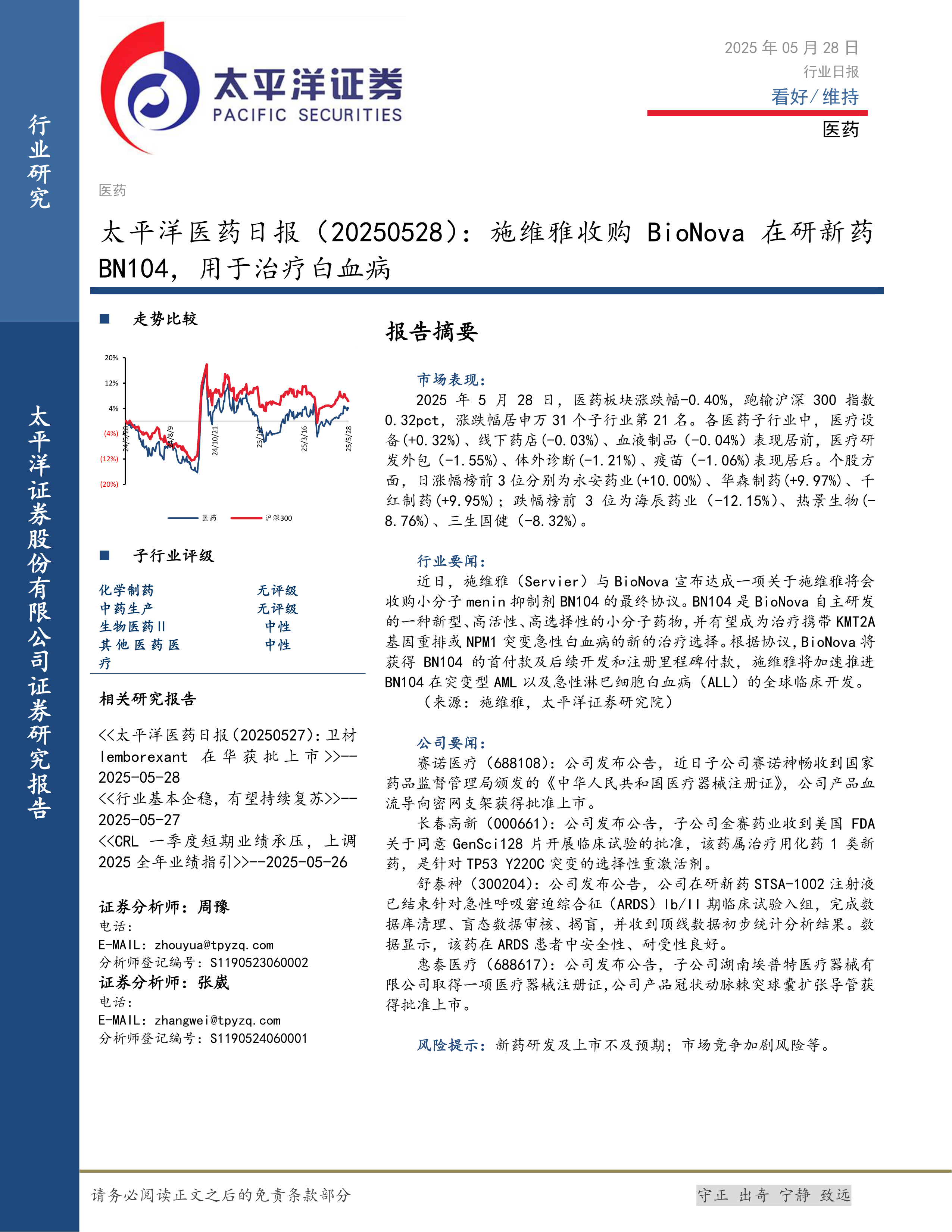 本报告对2025年5月28日医药行业的市场表现进行了分析,指出医药板块当日跑输沪深300指数。报告还列举了当日涨幅和跌幅居前的个股,反映了市场对不同公司业绩和事件的反应。