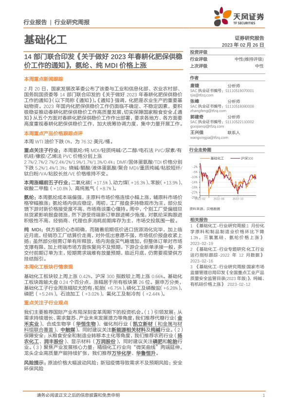基础化工行业研究周报:14部门联合印发《关于做好2023年春耕化肥保供稳价工作的通知》,氨纶、纯MDI价格上涨