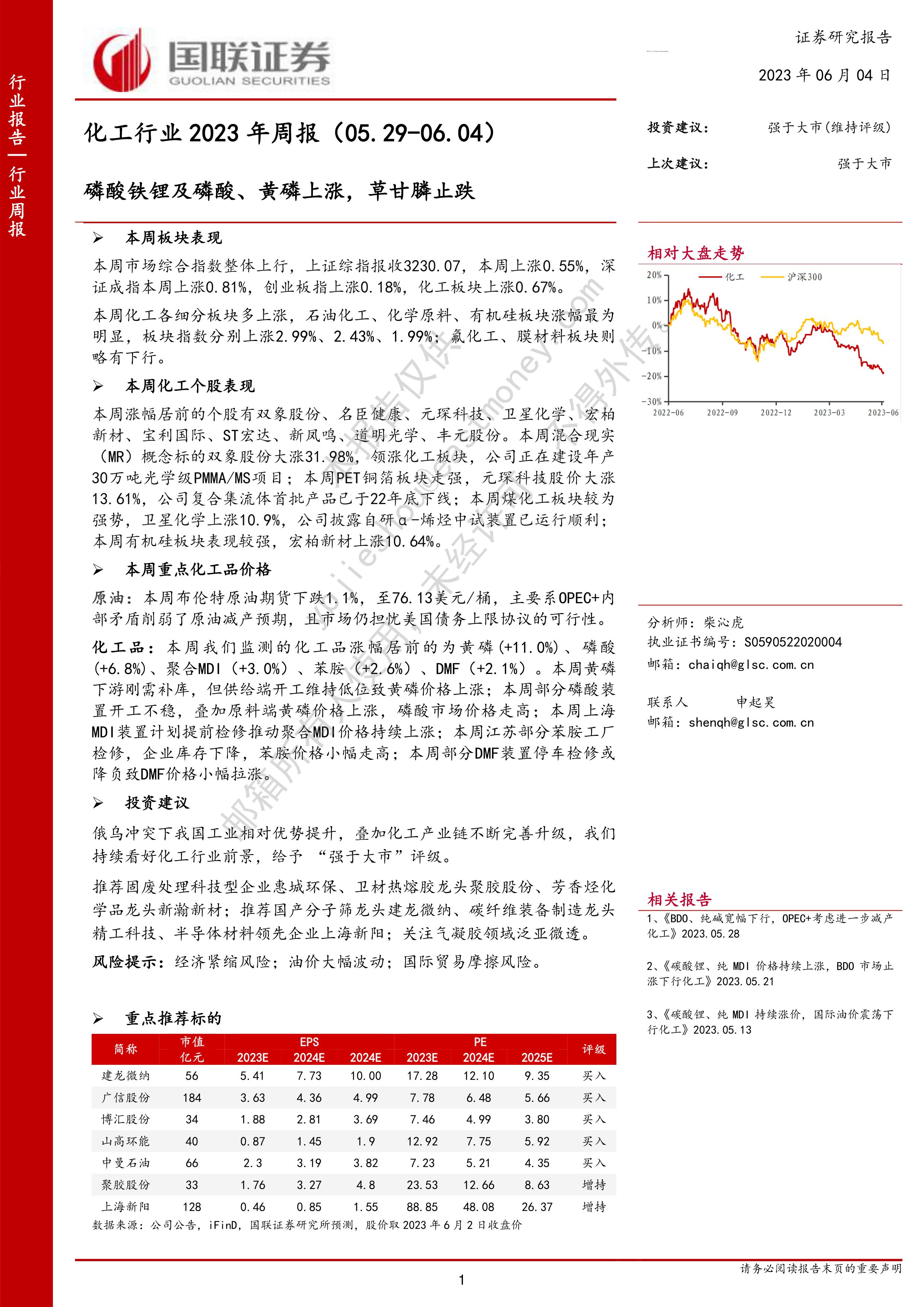 化工行业2023年周报:磷酸铁锂及磷酸、黄磷上涨,草甘膦止跌