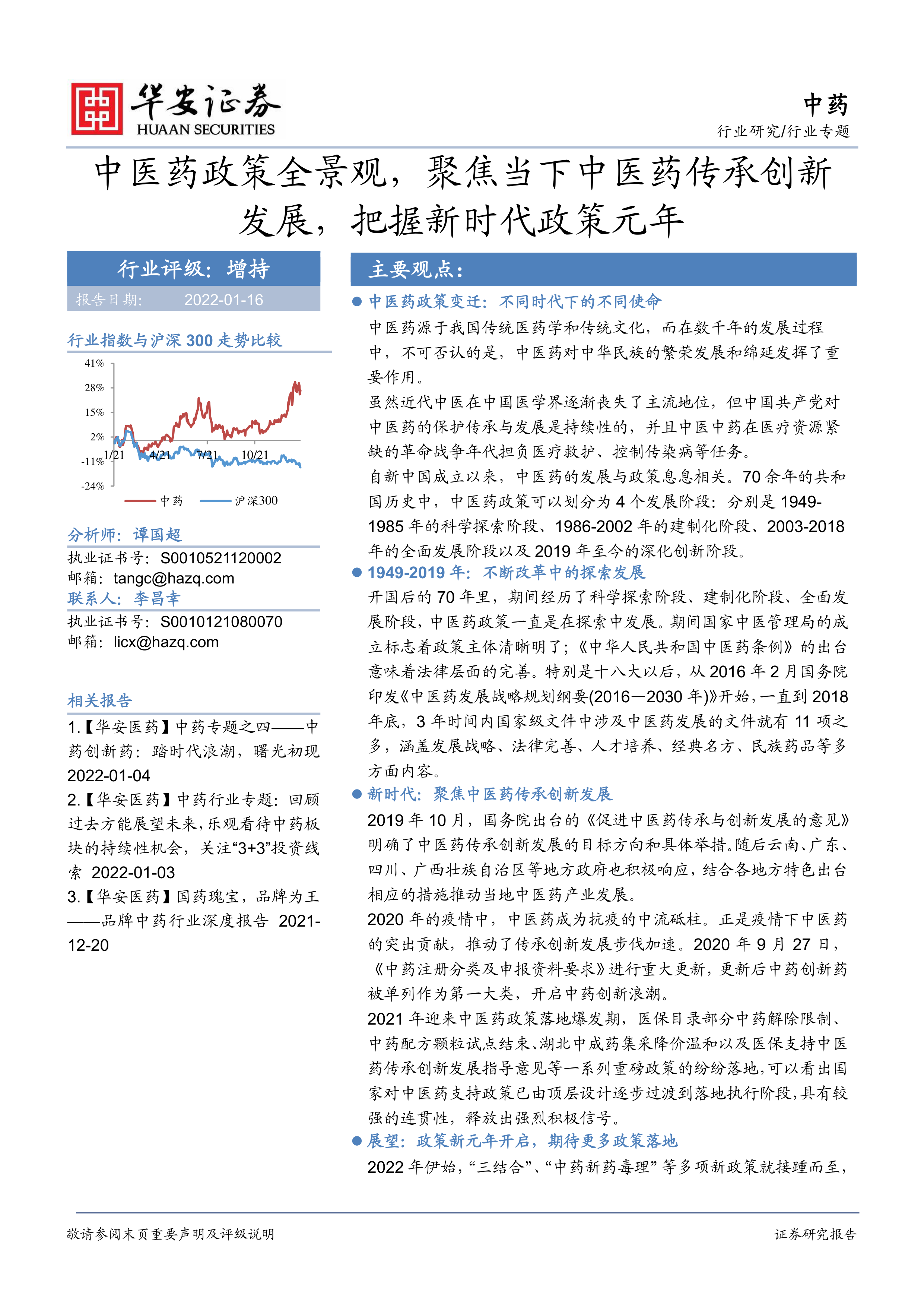 本报告全面梳理了中国中医药政策自1949年以来的演变历程,指出国家对中医药的保护传承与发展始终是持续性的。特别是党的十八大以来,中医药政策进入深化创新阶段,以《促进中医药传承创新发展的意见》为纲领,并在新冠疫情的催化下,政策落地步伐显著加快。2021年医保目录调整、中药配方颗粒试点结束、中成药集采温和降价以及医保支持中医药传承创新发展指导意见等一系列重磅政策的落地,标志着中医药行业已由顶层设计阶段迈入落地执行阶段,释放出强烈的积极信号。展望未来,沿着“传承”与“创新”两条主线,预计将有更多具体、实质性的政策出台,持续推动中医药高质量发展。在此背景下,报告重申“3+3”投资线索,建议关注老字号品牌中药、有提价能力的特色品种、有激励保障的低估值标的,以及中药创新药、地域性中药品牌和中药产业链相关投资机会。