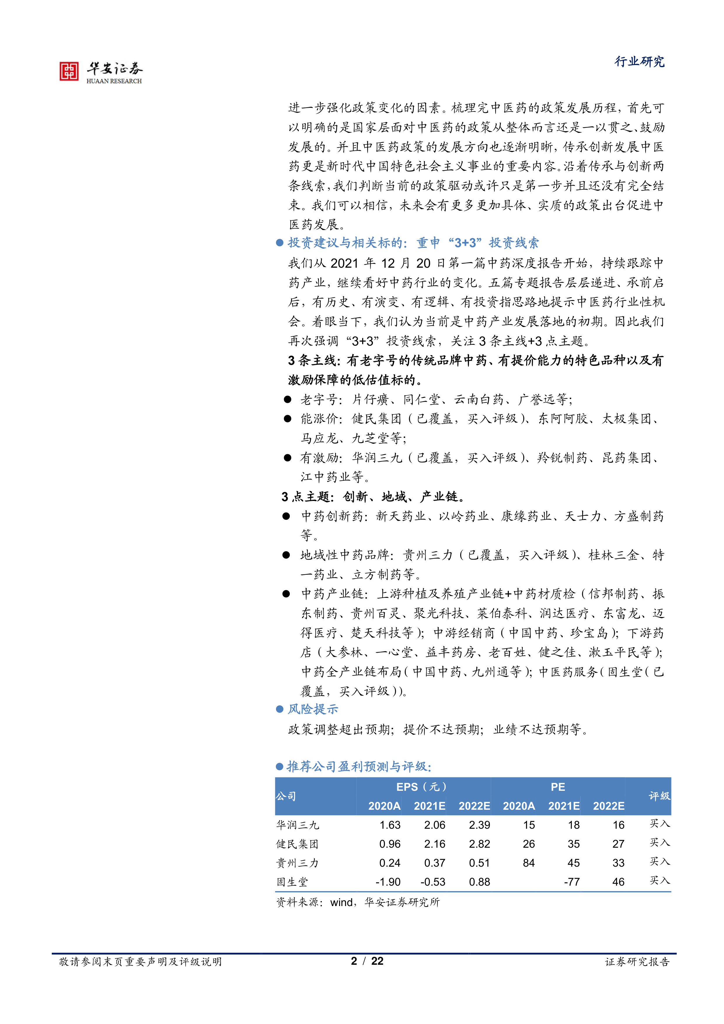 我们从2021年12月20日第一篇中药深度报告开始,持续跟踪中药产业,继续看好中药行业的变化。五篇专题报告层层递进、承前启后,有历史、有演变、有逻辑、有投资指思路地提示中医药行业性机会。着眼当下,我们认为当前是中药产业发展落地的初期。因此我们再次强调“3+3”投资线索,关注3条主线+3点主题。3条主线:有老字号的传统品牌中药、有提价能力的特色品种以及有激励保障的低估值标的。