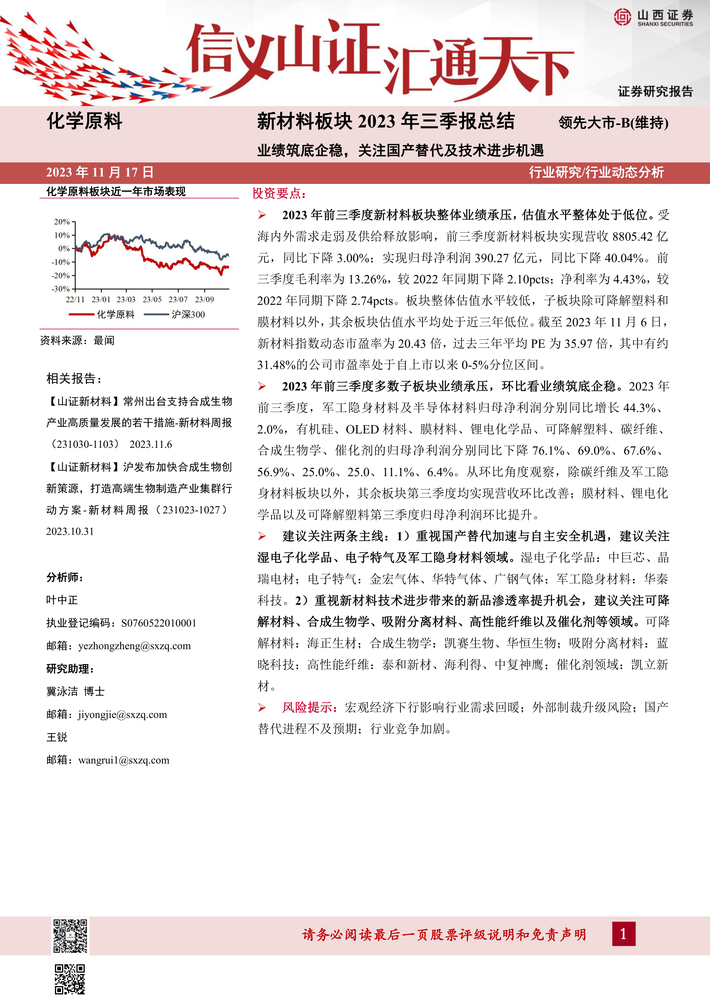建议关注两条主线:1)重视国产替代加速与自主安全机遇,建议关注湿电子化学品、电子特气及军工隐身材料领域。湿电子化学品:中巨芯、晶瑞电材;电子特气:金宏气体、华特气体、广钢气体;军工隐身材料:华秦科技。2)重视新材料技术进步带来的新品渗透率提升机会,建议关注可降解材料、合成生物学、吸附分离材料、高性能纤维以及催化剂等领域。可降解材料:海正生材;合成生物学:凯赛生物、华恒生物;吸附分离材料:蓝晓科技;高性能纤维:泰和新材、海利得、中复神鹰;催化剂领域:凯立新材。