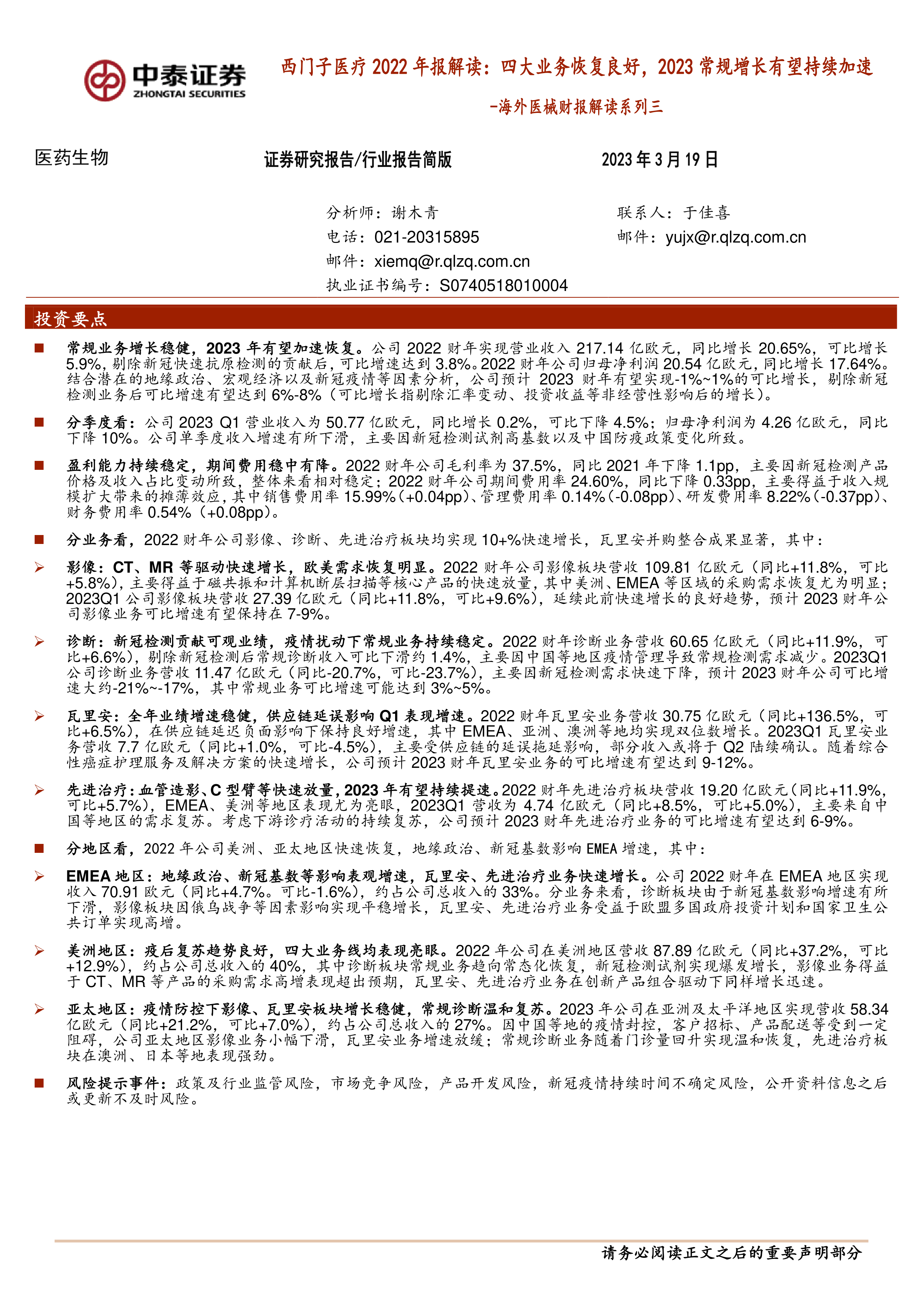 分季度看:公司2023Q1营业收入为50.77亿欧元,同比增长0.2%,可比下降4.5%;归母净利润为4.26亿欧元,同比下降10%。公司单季度收入增速有所下滑,主要因新冠检测试剂高基数以及中国防疫政策变化所致。