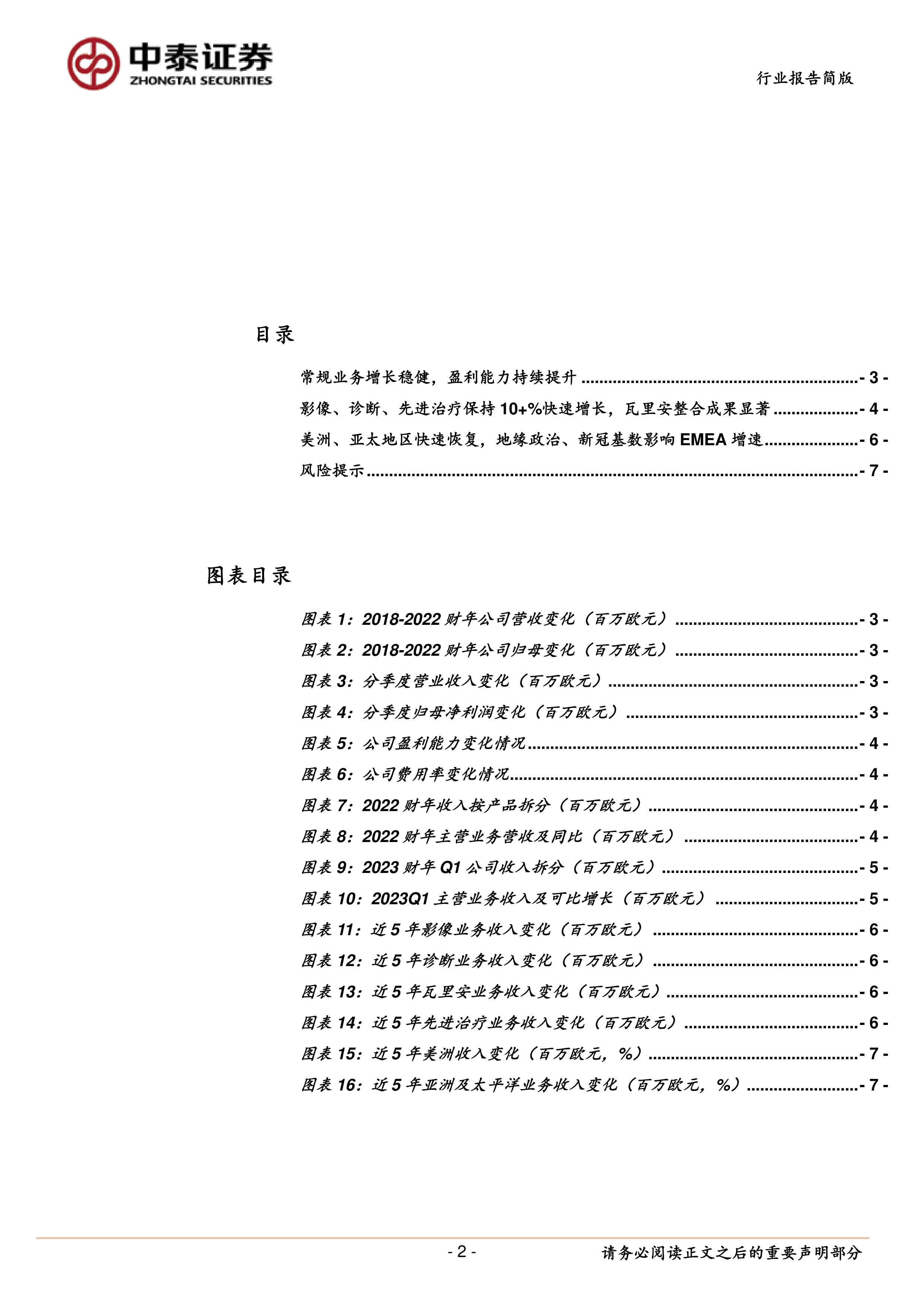 瓦里安:全年业绩增速稳健,供应链延误影响Q1表现增速。2022财年瓦里安业务营收30.75亿欧元(同比+136.5%,可比+6.5%),在供应链延迟负面影响下保持良好增速,其中EMEA、亚洲、澳洲等地均实现双位数增长。2023Q1瓦里安业务营收7.7亿欧元(同比+1.0%,可比-4.5%),主要受供应链的延误拖延影响,部分收入或将于Q2陆续确认。随着综合性癌症护理服务及解决方案的快速增长,公司预计2023财年瓦里安业务的可比增速有望达到9-12%。