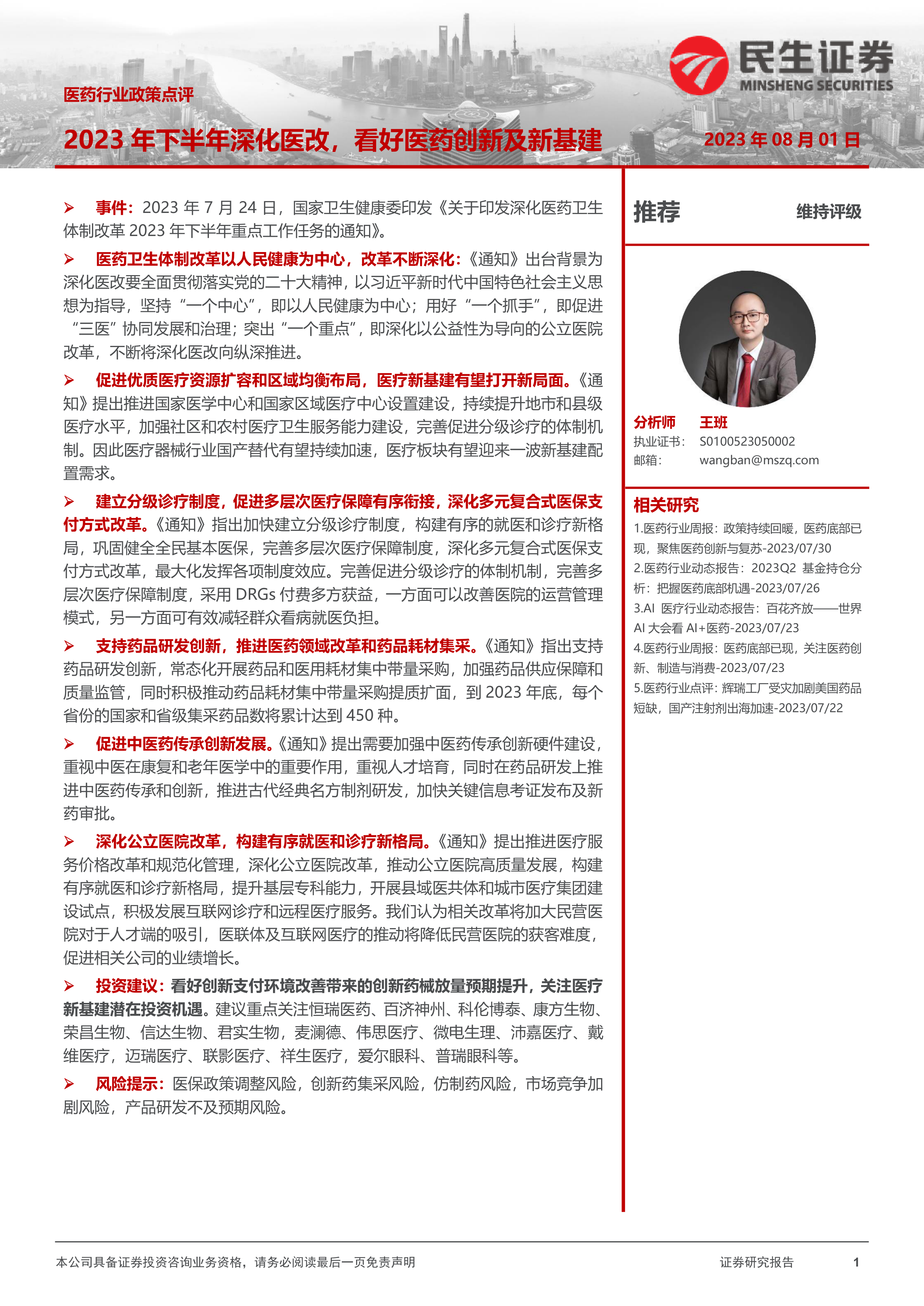医药行业政策点评:2023年下半年深化医改,看好医药创新及新基建