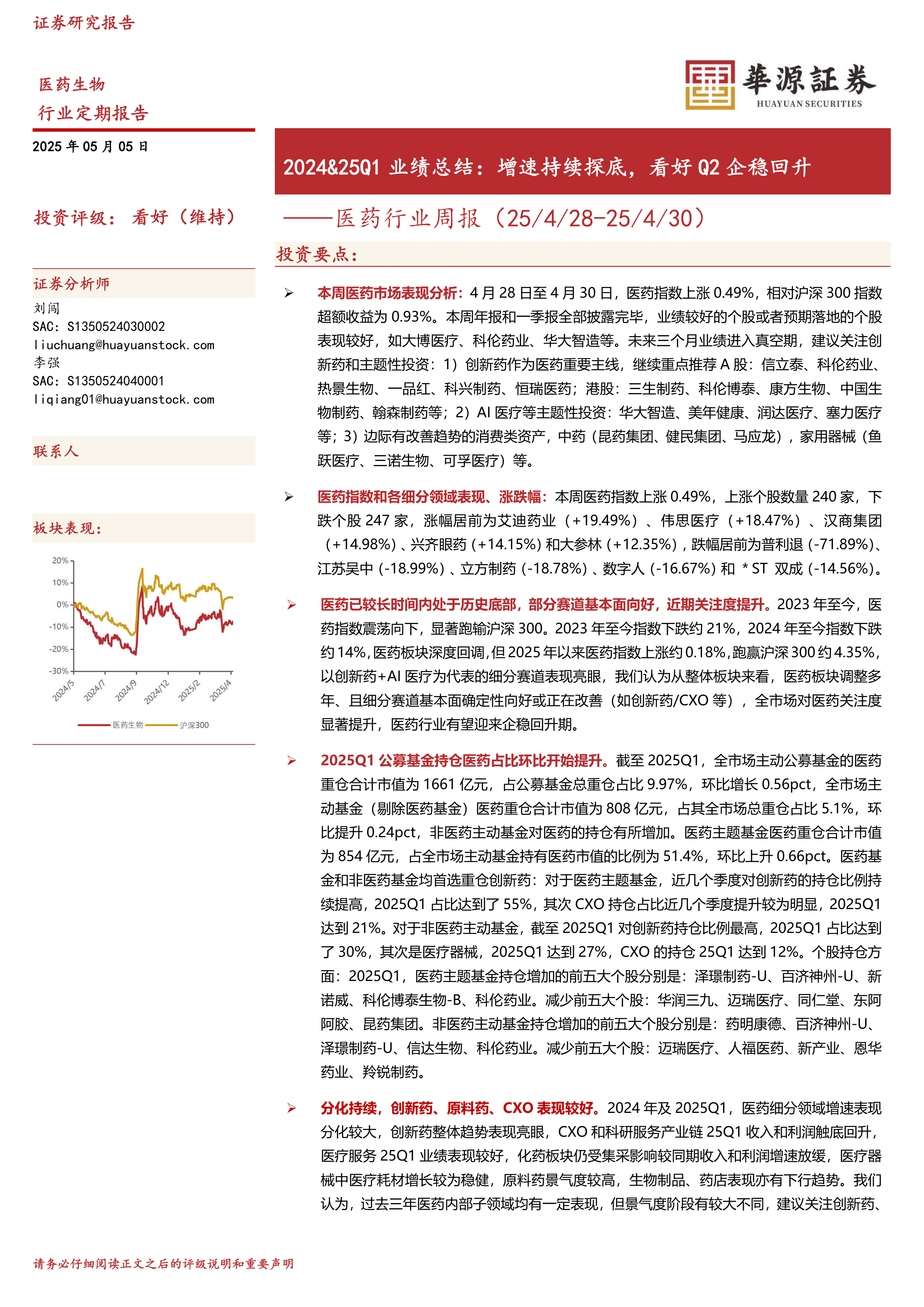 本周医药市场表现分析:4月28日至4月30日,医药指数上涨0.49%,相对沪深300指数超额收益为0.93%。本周年报和一季报全部披露完毕,业绩较好的个股或者预期落地的个股表现较好,如大博医疗、科伦药业、华大智造等。未来三个月业绩进入真空期,建议关注创新药和主题性投资:1)创新药作为医药重要主线,继续重点推荐A股:信立泰、科伦药业、热景生物、一品红、科兴制药、恒瑞医药;港股:三生制药、科伦博泰、康方生物、中国生物制药、翰森制药等;2)AI医疗等主题性投资:华大智造、美年健康、润达医疗、塞力医疗等;3)边际有改善趋势的消费类资产,中药(昆药集团、健民集团、马应龙),家用器械(鱼跃医疗、三诺生物、可孚医疗)等。