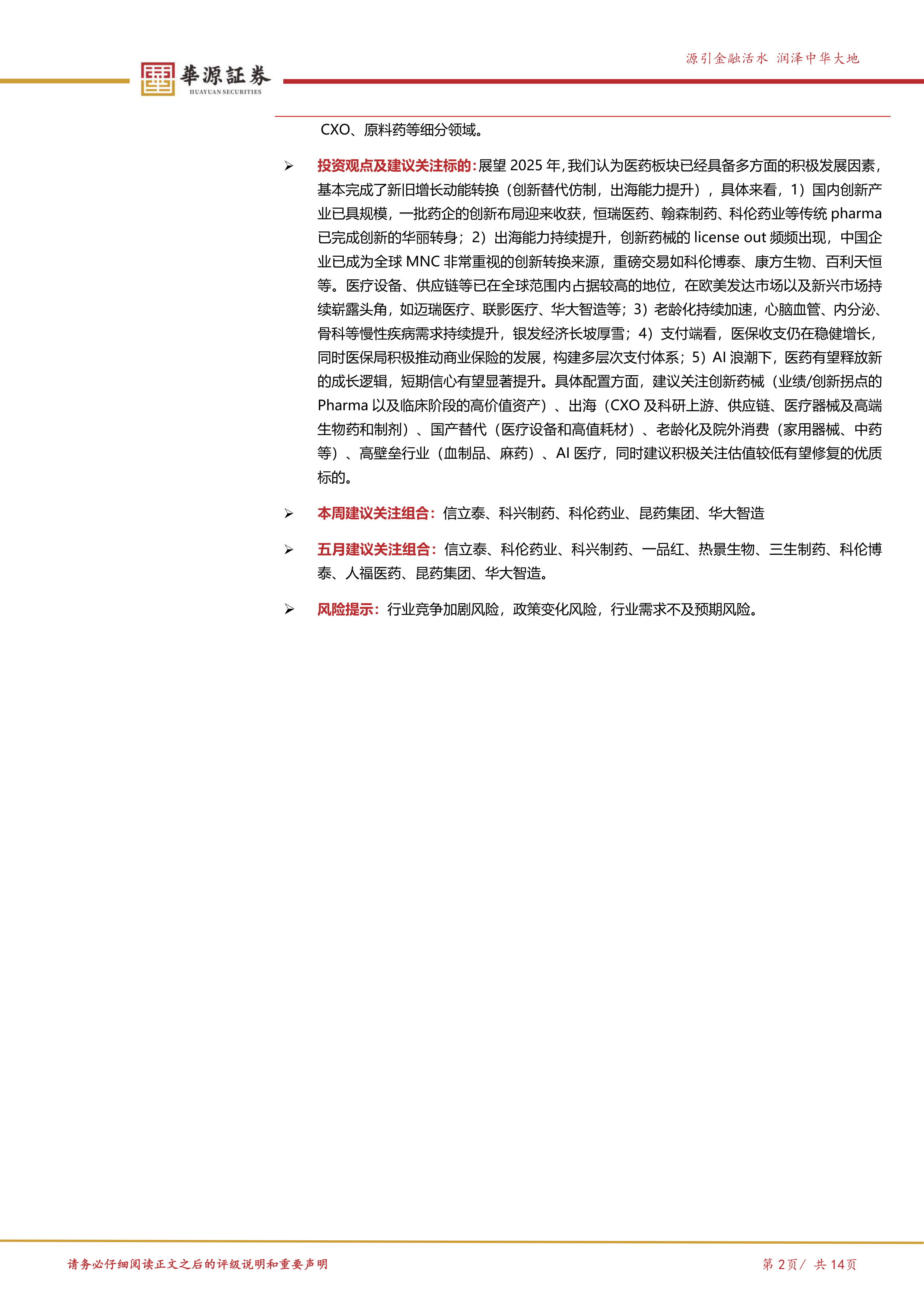 投资观点及建议关注标的:展望2025年,我们认为医药板块已经具备多方面的积极发展因素,基本完成了新旧增长动能转换(创新替代仿制,出海能力提升),具体来看,1)国内创新产业已具规模,一批药企的创新布局迎来收获,恒瑞医药、翰森制药、科伦药业等传统pharma已完成创新的华丽转身;2)出海能力持续提升,创新药械的licenseout频频出现,中国企业已成为全球MNC非常重视的创新转换来源,重磅交易如科伦博泰、康方生物、百利天恒等。医疗设备、供应链等已在全球范围内占据较高的地位,在欧美发达市场以及新兴市场持续崭露头角,如迈瑞医疗、联影医疗、华大智造等;3)老龄化持续加速,心脑血管、内分泌、骨科等慢性疾病需求持续提升,银发经济长坡厚雪;4)支付端看,医保收支仍在稳健增长,同时医保局积极推动商业保险的发展,构建多层次支付体系;5)AI浪潮下,医药有望释放新的成长逻辑,短期信心有望显著提升。具体配置方面,建议关注创新药械(业绩/创新拐点的Pharma以及临床阶段的高价值资产)、出海(CXO及科研上游、供应链、医疗器械及高端生物药和制剂)、国产替代(医疗设备和高值耗材)、老龄化及院外消费(家用器械、中药等)、高壁垒行业(血制品、麻药)、AI医疗,同时建议积极关注估值较低有望修复的优质标的。