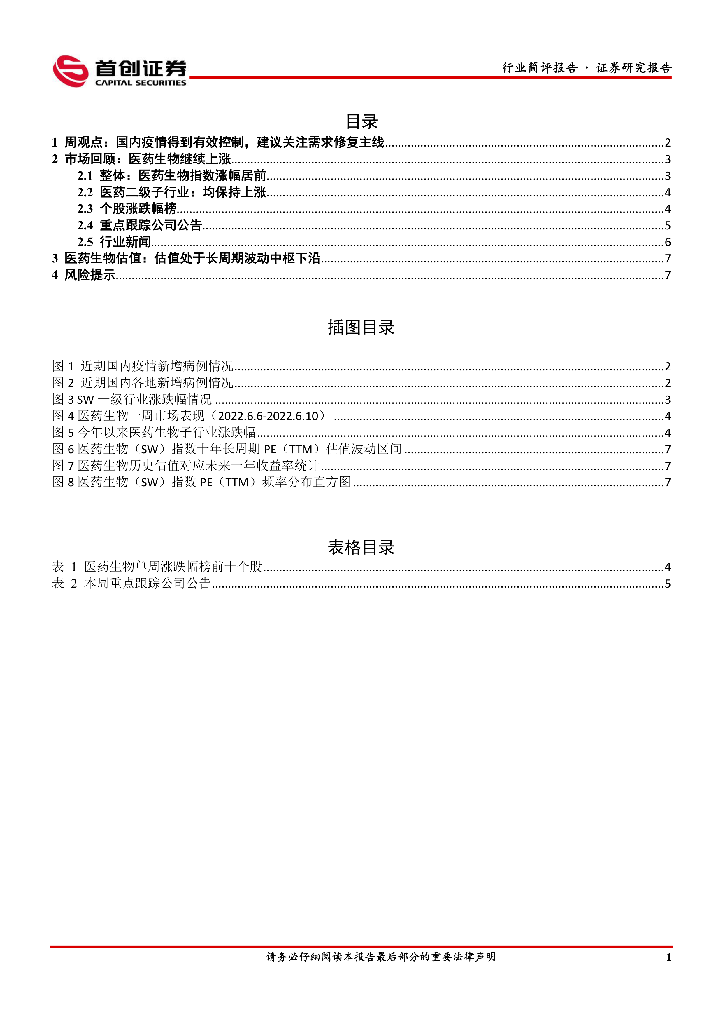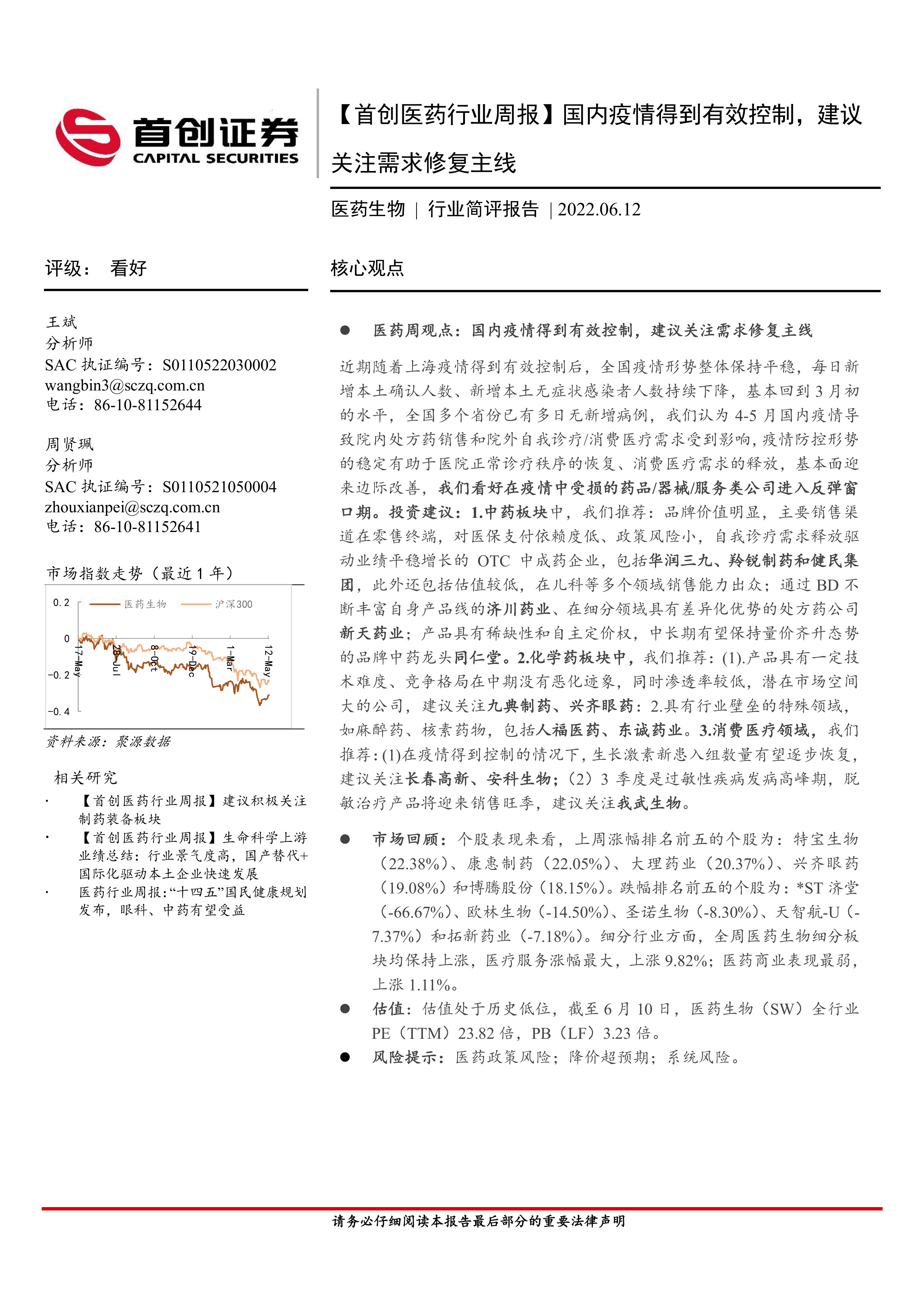 近期随着上海疫情得到有效控制后,全国疫情形势整体保持平稳,每日新增本土确认人数、新增本土无症状感染者人数持续下降,基本回到3月初的水平,全国多个省份已有多日无新增病例,我们认为4-5月国内疫情导致院内处方药销售和院外自我诊疗/消费医疗需求受到影响,疫情防控形势的稳定有助于医院正常诊疗秩序的恢复、消费医疗需求的释放,基本面迎来边际改善,我们看好在疫情中受损的药品/器械/服务类公司进入反弹窗口期。投资建议:1.中药板块中,我们推荐:品牌价值明显,主要销售渠道在零售终端,对医保支付依赖度低、政策风险小,自我诊疗需求释放驱动业绩平稳增长的OTC中成药企业,包括华润三九、羚锐制药和健民集团,此外还包括估值较低,在儿科等多个领域销售能力出众;通过BD不断丰富自身产品线的济川药业、在细分领域具有差异化优势的处方药公司新天药业;产品具有稀缺性和自主定价权,中长期有望保持量价齐升态势的品牌中药龙头同仁堂。2.化学药板块中,我们推荐:(1).产品具有一定技术难度、竞争格局在中期没有恶化迹象,同时渗透率较低,潜在市场空间大的公司,建议关注九典制药、兴齐眼药:2.具有行业壁垒的特殊领域,如麻醉药、核素药物,包括人福医药、东诚药业。3.消费医疗领域,我们推荐:(1)在疫情得到控制的情况下,生长激素新患入组数量有望逐步恢复,建议关注长春高新、安科生物;(2)3季度是过敏性疾病发病高峰期,脱敏治疗产品将迎来销售旺季,建议关注我武生物。