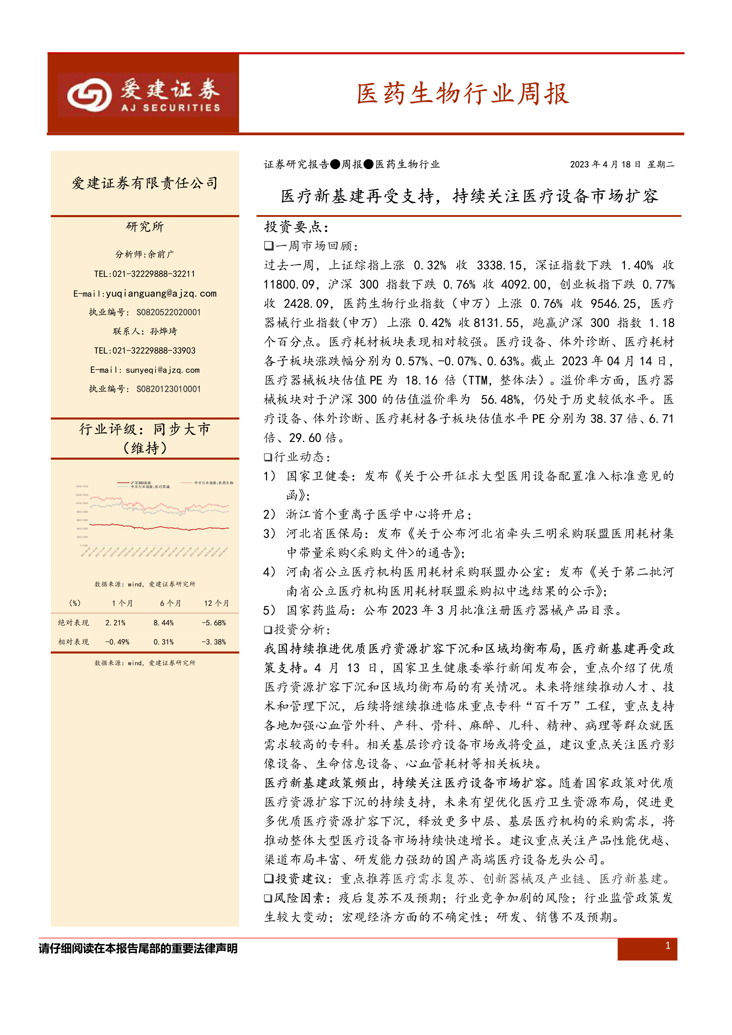 本周的医药生物行业周报显示,在国家政策的大力支持下,医疗新基建迎来新的发展机遇。优质医疗资源持续扩容下沉,基层医疗机构的诊疗设备需求有望得到释放,医疗设备市场将迎来持续快速增长。建议关注医疗影像设备、生命信息设备、心血管耗材等相关板块,以及产品性能优越、渠道布局丰富、研发能力强劲的国产高端医疗设备龙头公司。