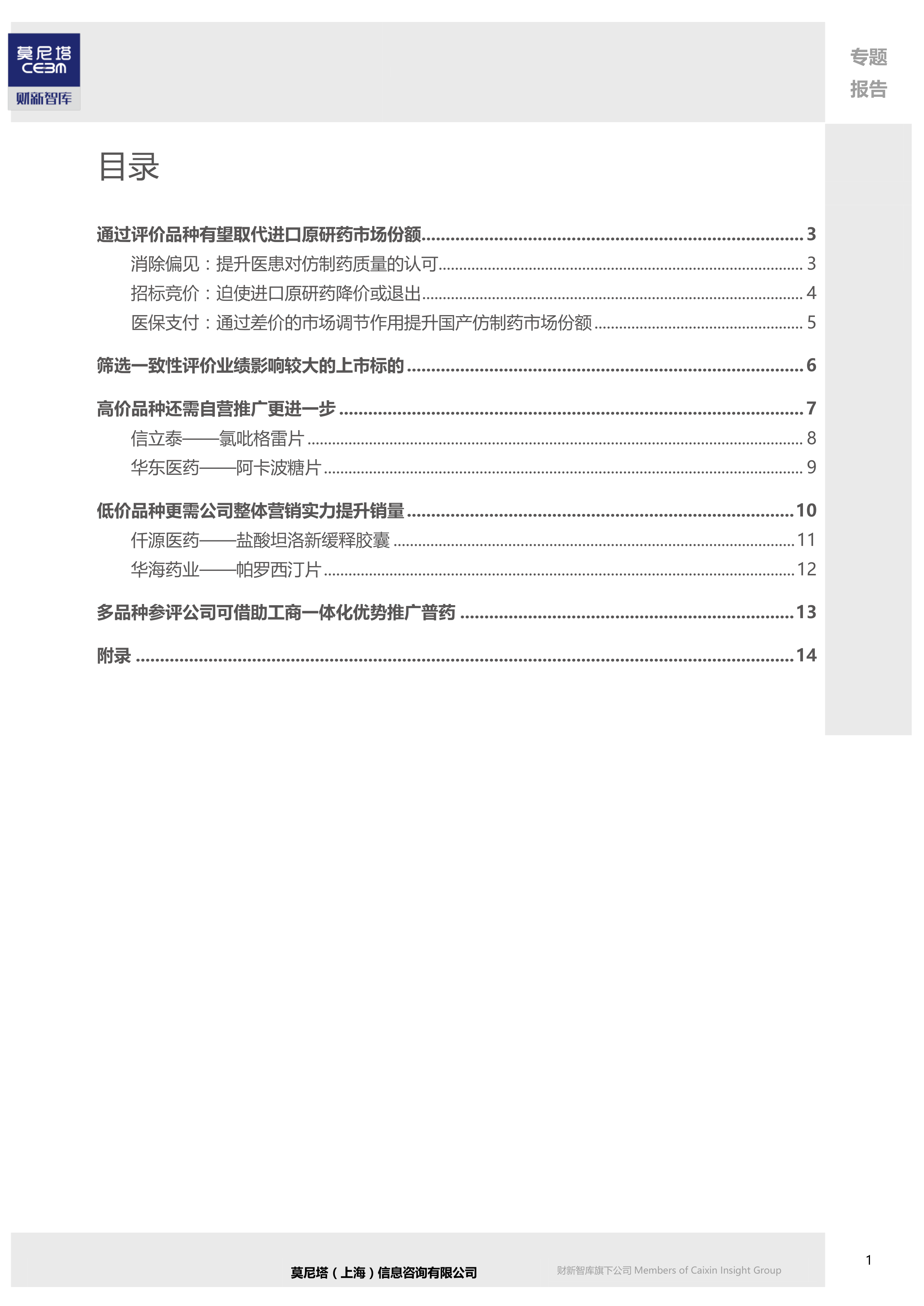 本报告的核心观点在于,中国自2016年2月全面启动的仿制药质量和疗效一致性评价工作,是国家医药政策的重要战略举措,旨在提升国产仿制药的整体质量水平,并重塑现有药品市场格局。通过一致性评价的国产仿制药,将有望凭借其与原研药一致的质量和疗效,结合其固有的价格优势,逐步取代进口原研药的市场份额。这一过程将主要通过消除医患对仿制药的偏见、在药品招标采购中与原研药同台竞价以及医保支付标准的引导作用来实现。