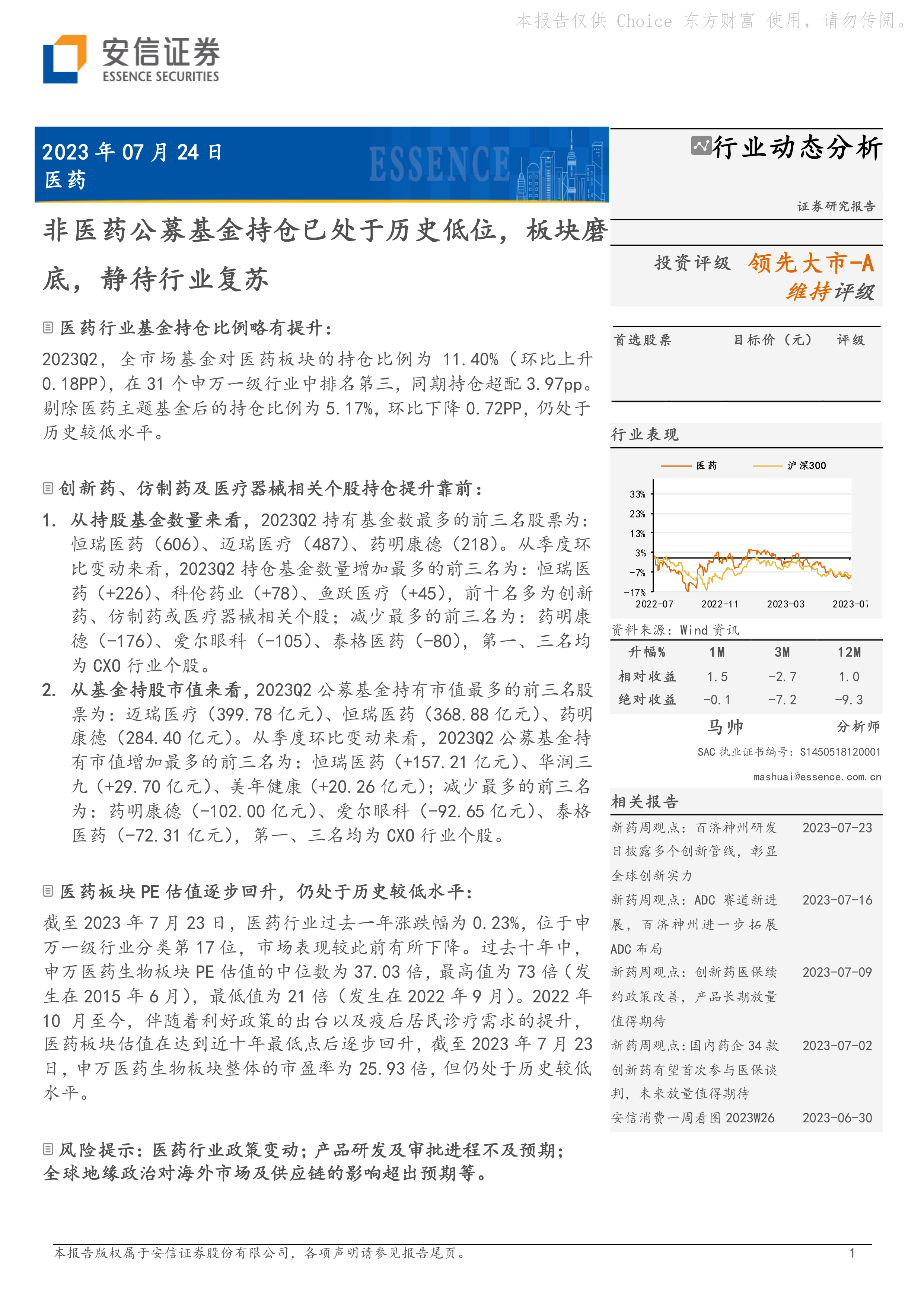 本报告分析了2023年Q2公募基金在医药行业的持仓情况,以及医药板块的运行情况。主要结论如下: