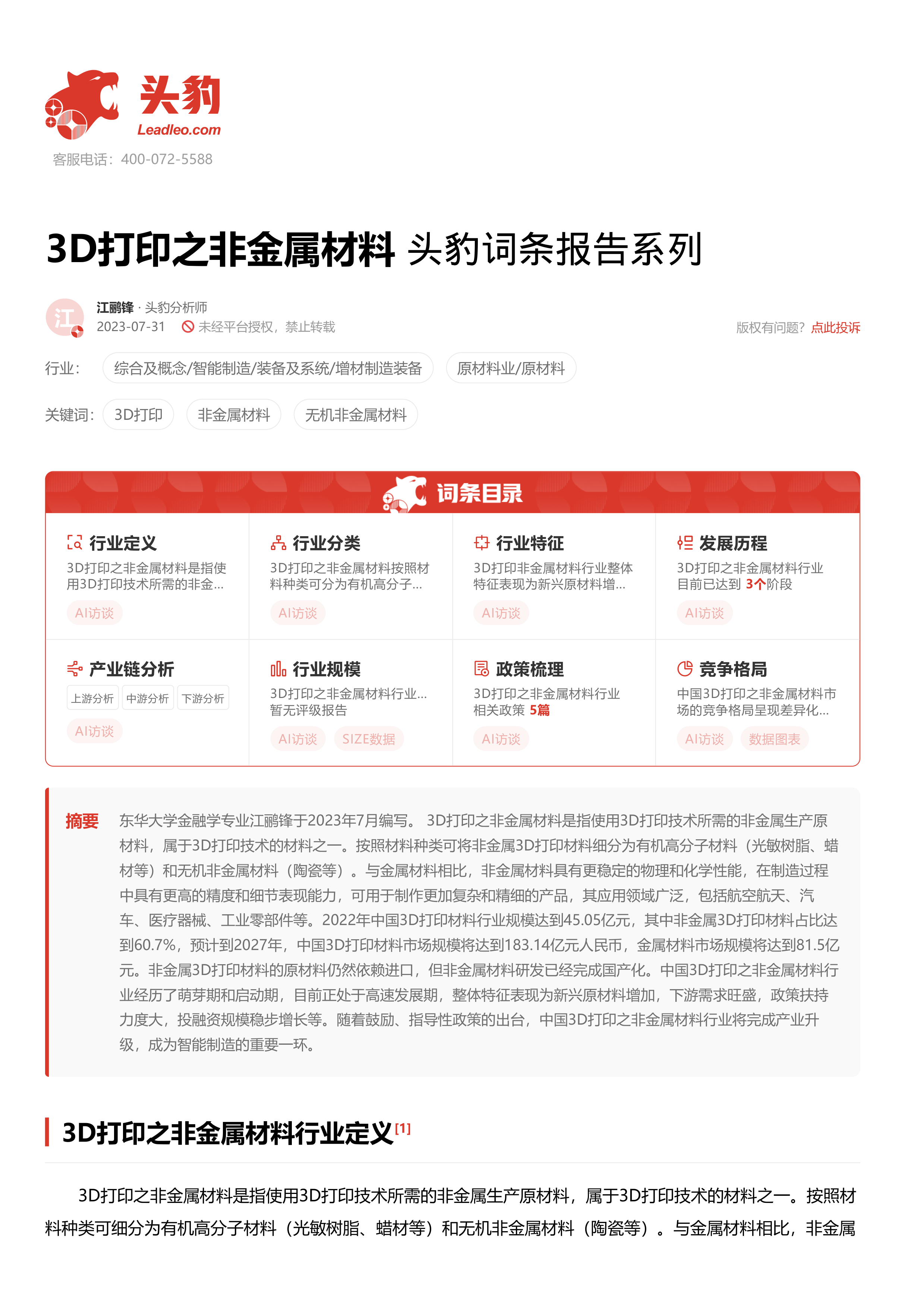 东华大学金融学专业江鹂锋于2023年7月编写。3D打印之非金属材料是指使用3D打印技术所需的非金属生产原材料,属于3D打印技术的材料之一。按照材料种类可将非金属3D打印材料细分为有机高分子材料(光敏树脂、蜡材等)和无机非金属材料(陶瓷等)。与金属材料相比,非金属材料具有更稳定的物理和化学性能,在制造过程中具有更高的精度和细节表现能力,可用于制作更加复杂和精细的产品,其应用领域广泛,包括航空航天、汽车、医疗器械、工业零部件等。2022年中国3D打印材料行业规模达到45.05亿元,其中非金属3D打印材料占比达到60.7%,预计到2027年,中国3D打印材料市场规模将达到183.14亿元人民币,金属材料市场规模将达到81.5亿元。非金属3D打印材料的原材料仍然依赖进口,但非金属材料研发已经完成国产化。中国3D打印之非金属材料行业经历了萌芽期和启动期,目前正处于高速发展期,整体特征表现为新兴原材料增加,下游需求旺盛,政策扶持力度大,投融资规模稳步增长等。随着鼓励、指导性政策的出台,中国3D打印之非金属材料行业将完成产业升级,成为智能制造的重要一环。