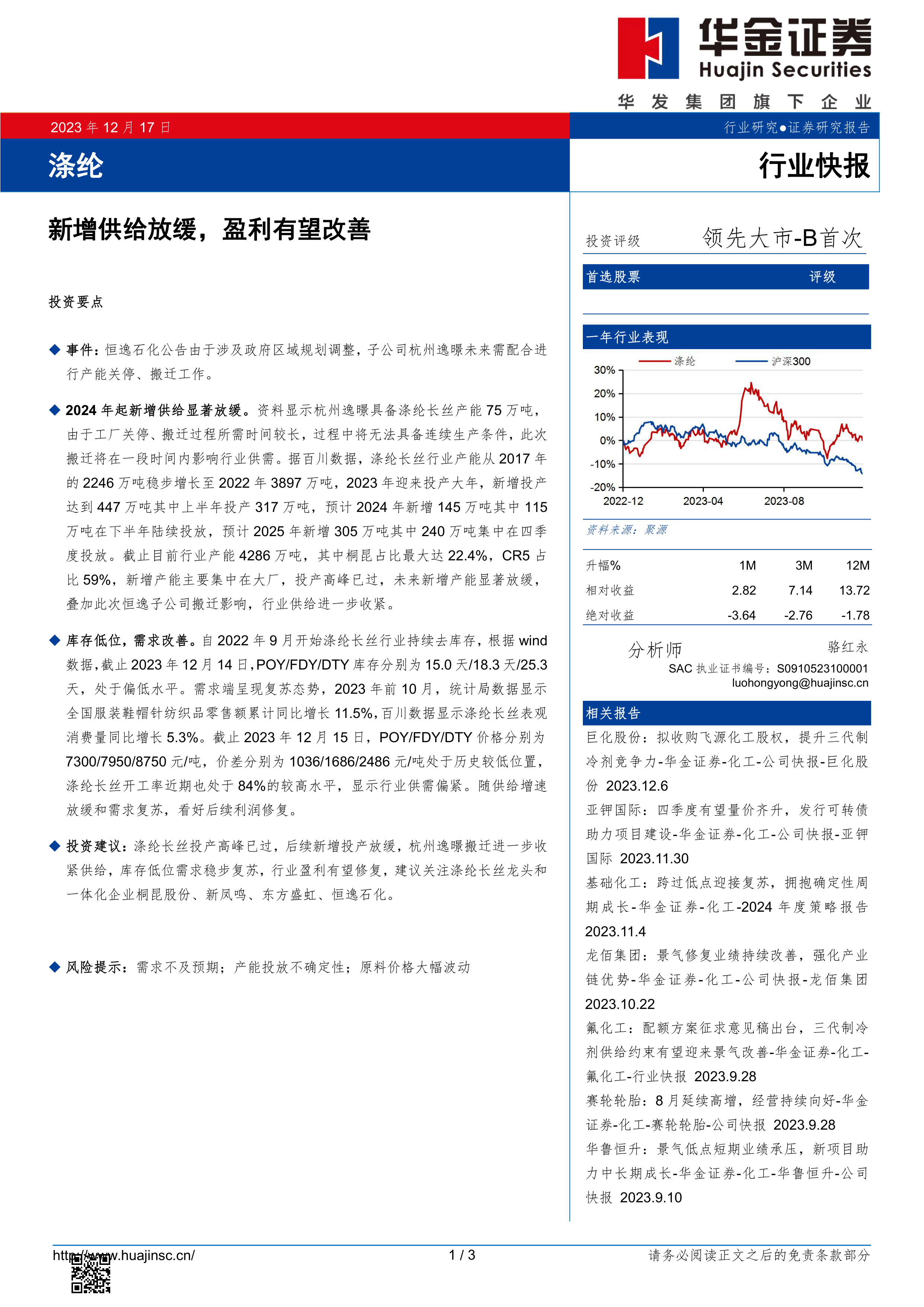 基于对行业供需格局的分析,报告建议关注涤纶长丝龙头企业和一体化企业,以把握行业盈利改善带来的投资机会,同时提示了相关风险。