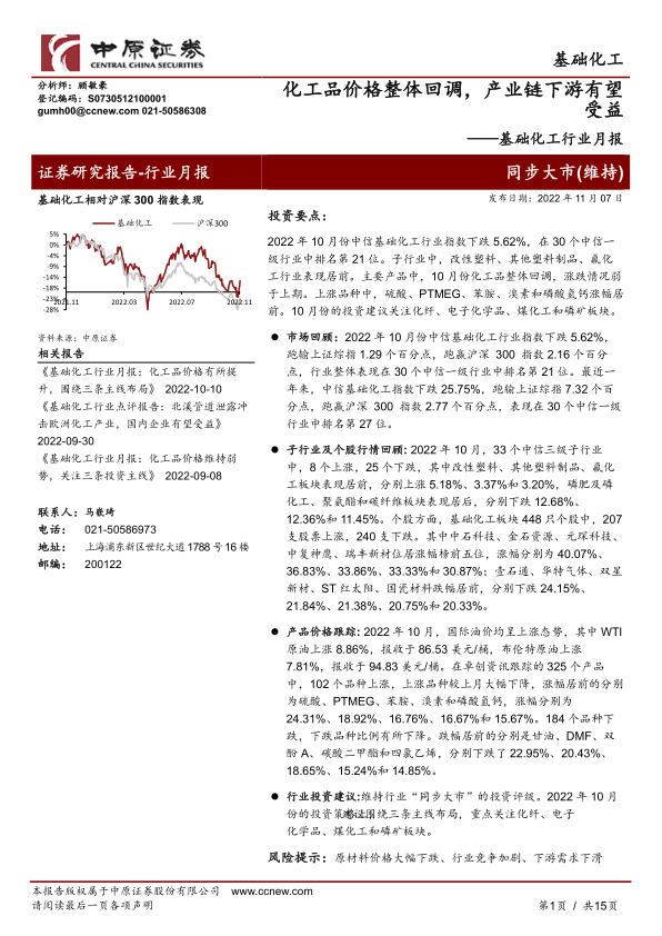 2022年10月,中信基础化工行业指数整体下跌5.62%,在30个中信一级行业中排名第21位,显示出行业面临的下行压力。尽管如此,部分子行业如改性塑料、其他塑料制品和氟化工表现居前。在化工品价格普遍回调的背景下,硫酸、PTMEG、苯胺、溴素和磷酸氢钙等少数品种逆势上涨。鉴于全球经济下行压力和下游需求疲弱,本报告维持行业“同步大市”的投资评级,并建议投资者围绕三条主线进行布局:关注受益于成本下行的产业链下游品种(如化纤)、受益于芯片国产化趋势的电子化学品,以及具有较强资源属性的化工企业(如煤化工和磷矿)。