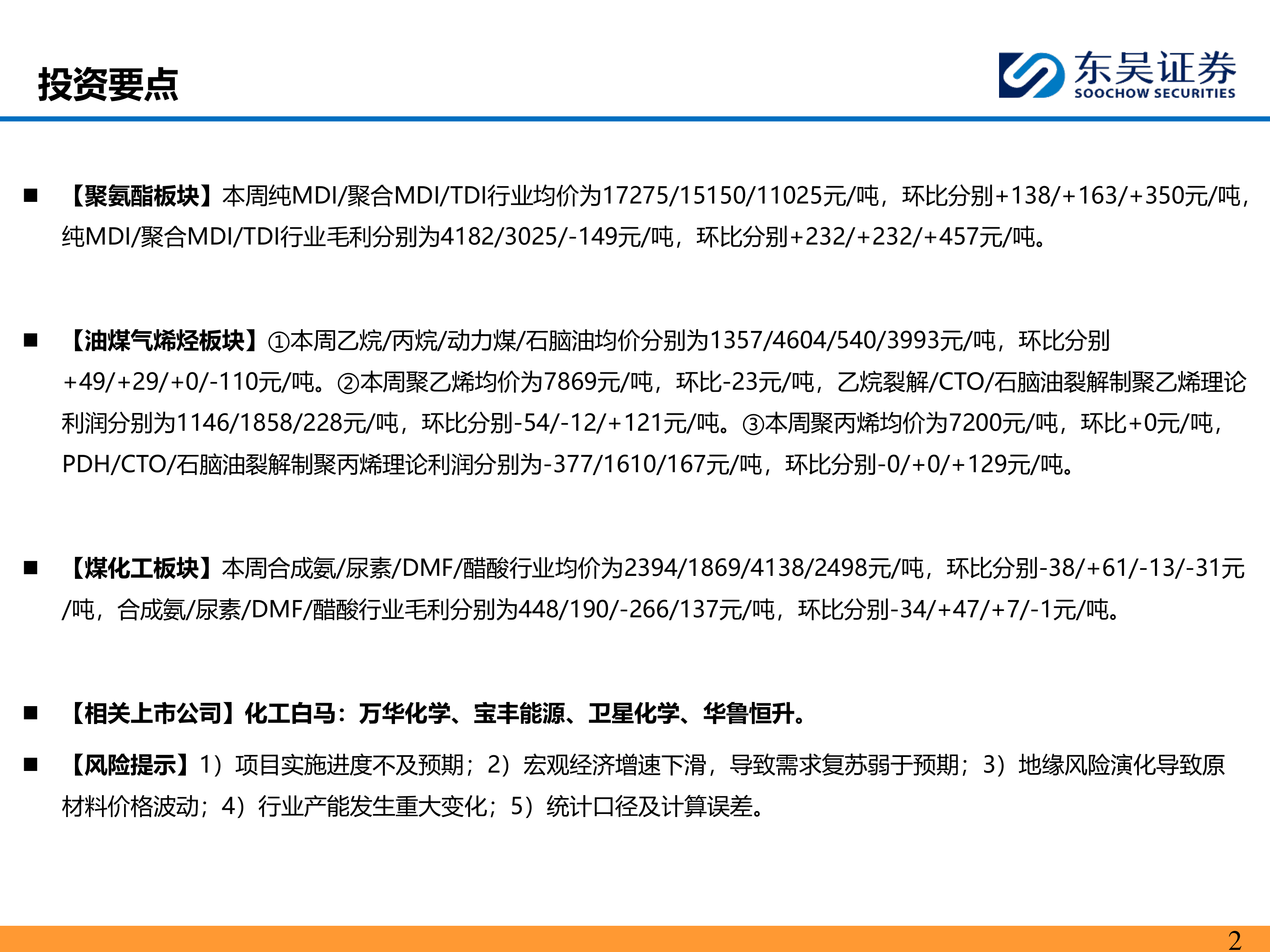 本周基础化工行业各板块表现分化。聚氨酯板块价格上涨,毛利改善;油煤气烯烃板块乙烯、丙烯价格承压,盈利能力面临挑战;煤化工板块产品价格和毛利涨跌互现。投资者应关注结构性机会,结合具体产品和公司基本面进行分析。