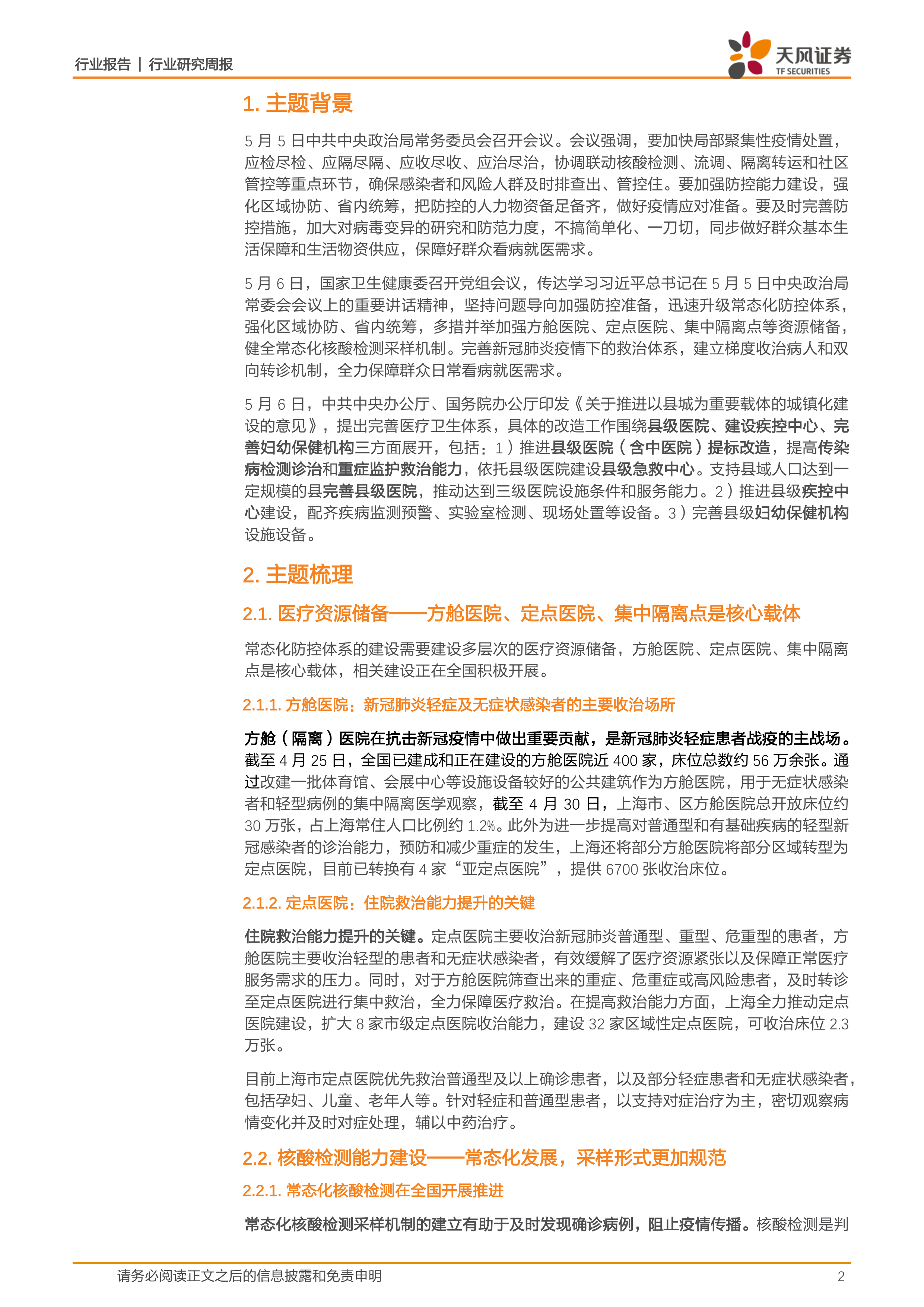 本报告核心观点指出,随着中国常态化疫情防控体系的逐步建立和完善,医药生物行业将迎来结构性投资机会。中央政治局常委会会议强调的“四应四尽”原则以及加强防控能力建设,为医疗资源储备、核酸检测能力提升和整体救治体系完善指明了方向。