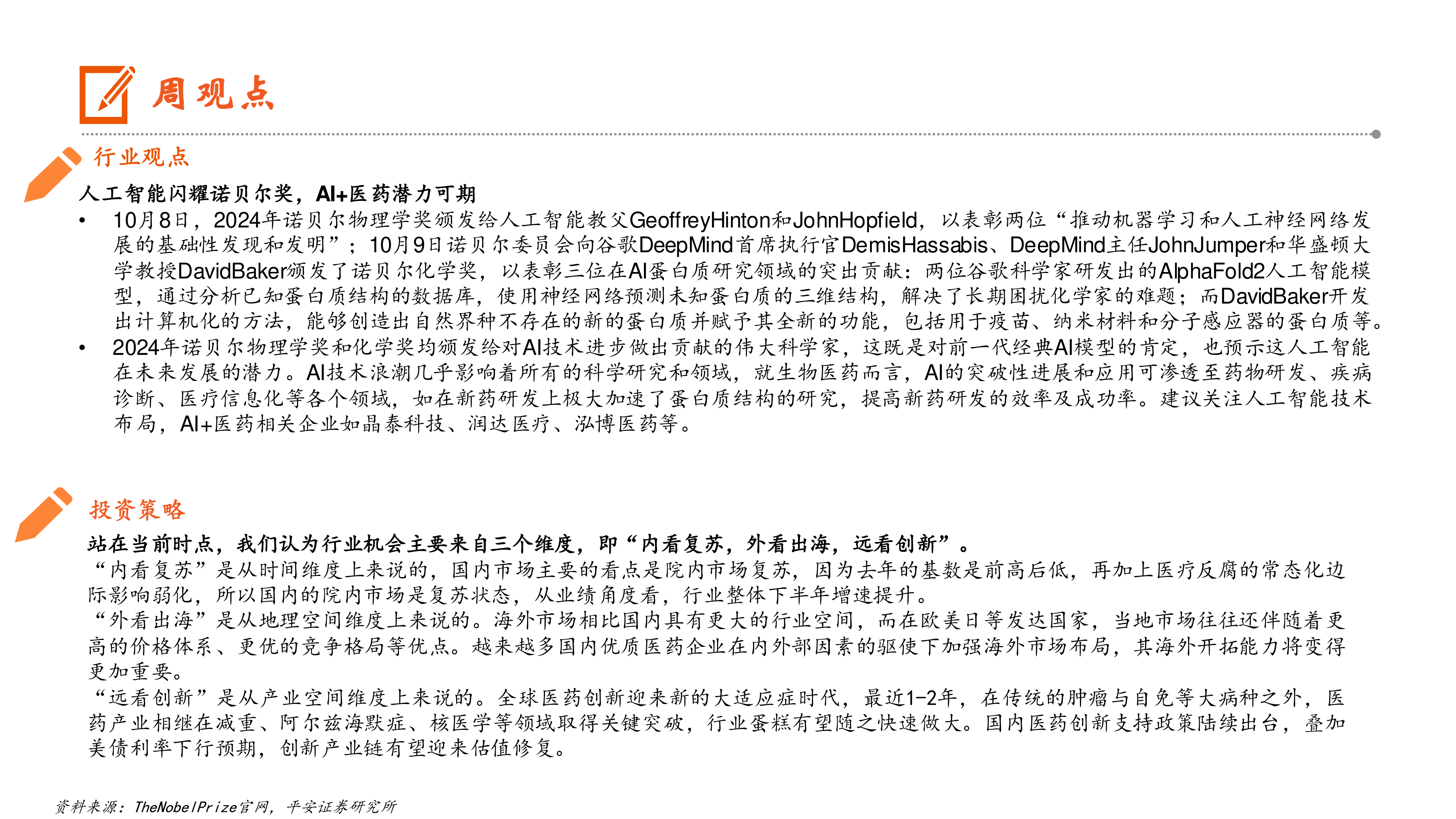本报告首先指出人工智能在生物医药领域的巨大潜力。2024年诺贝尔物理学奖和化学奖均颁发给对AI技术进步做出贡献的科学家,表彰其在机器学习、人工神经网络发展以及AI蛋白质研究(如AlphaFold2模型)和新型蛋白质设计方面的突破。这预示着AI技术将深刻影响药物研发、疾病诊断和医疗信息化等领域,显著提升新药研发效率和成功率。报告建议关注人工智能技术布局及AI+医药相关企业,如晶泰科技、润达医疗、泓博医药。