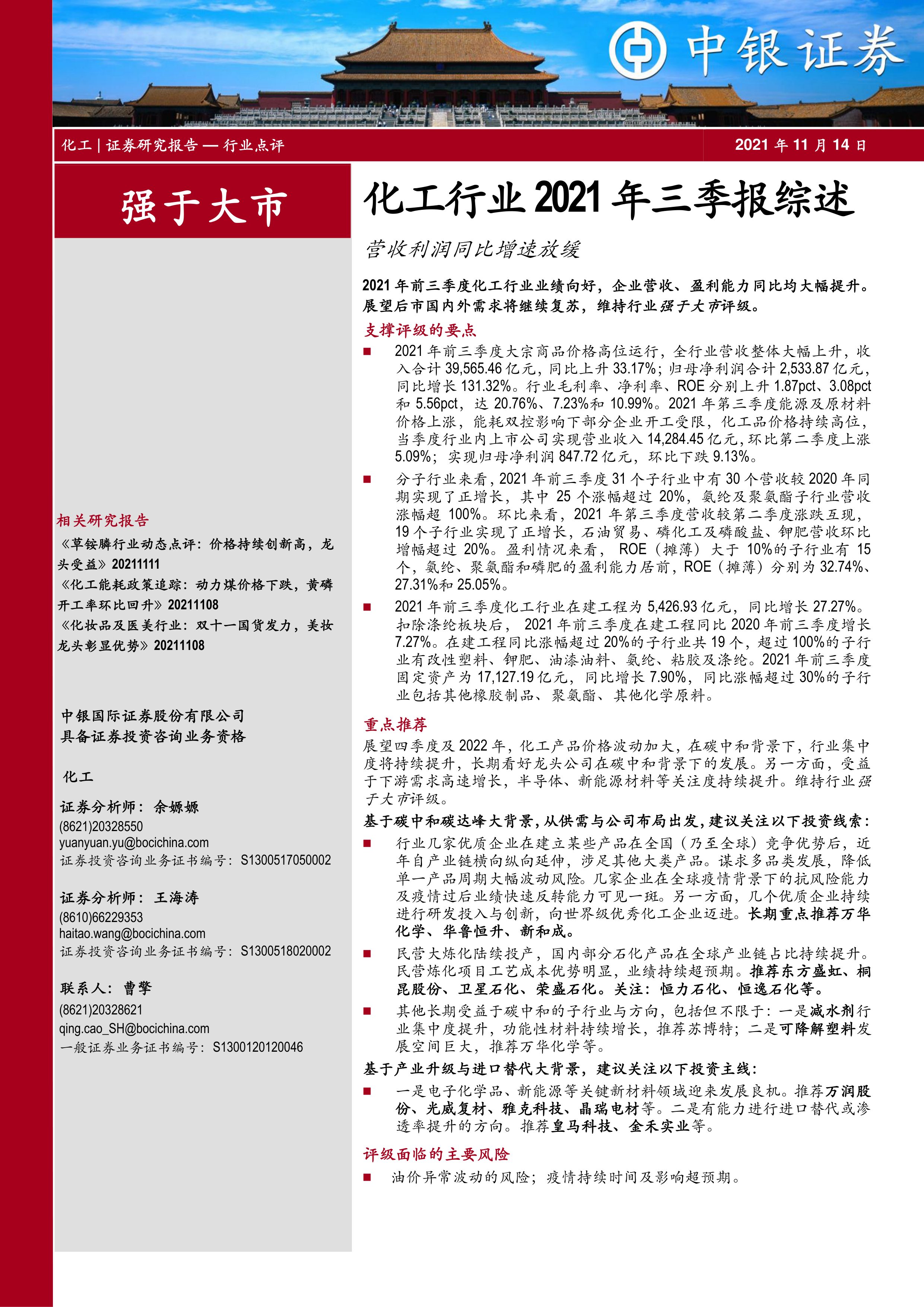 2021年前三季度化工行业业绩向好,企业营收、盈利能力同比均大幅提升。展望后市国内外需求将继续复苏,维持行业强于大市评级。