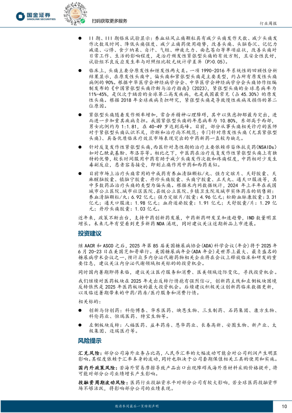 中药板块,2025年6月9日,方盛制药自主研发的1.1类中药创新药养血祛风止痛颗粒获批上市。该药基于张锡纯先生的“升陷汤”加减配方而成,能够补气养血,散风止痛。II期、III期临床试验显示,养血祛风止痛颗粒能有效减少头痛发作天数、次数及时间,降低头痛强度,减少止痛药使用,并改善头痛、头脑昏沉、记忆力减退等单项症状,且安全性良好。紧张型头痛是全球第二高发疾病,我国年患病率为10.80%,但目前针对原发性头痛(尤其紧张型头痛)的优质中药新药较为缺乏。中医药在治疗反复发作性紧张型头痛方面具有独特优势,长期服用有助于减少头痛发作次数和疼痛程度,且毒副反应相对较少。近年来,政策不断出台支持中药创新药发展,中药新药研发呈加速趋势,IND数量明显增长,未来几年有望看到更多新药NDA涌现。
