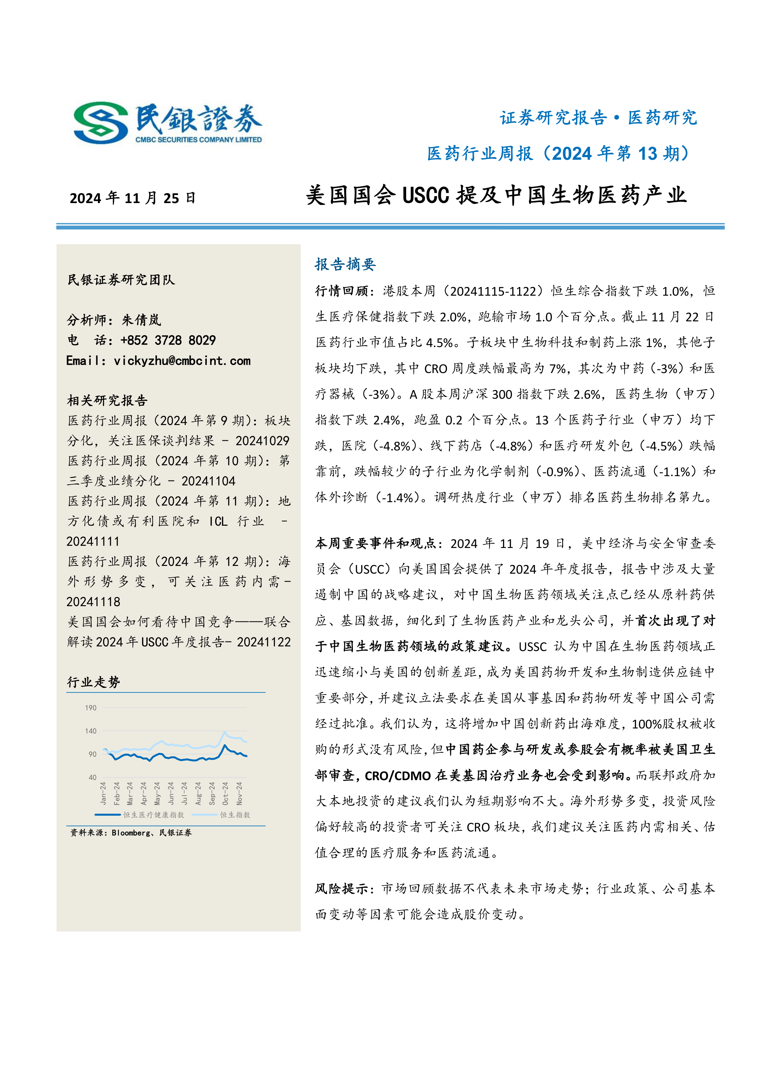 本周重要事件和观点:2024年11月19日,美中经济与安全审查委员会(USCC)向美国国会提供了2024年年度报告,报告中涉及大量遏制中国的战略建议,对中国生物医药领域关注点已经从原料药供应、基因数据,细化到了生物医药产业和龙头公司,并首次出现了对于中国生物医药领域的政策建议。USSC认为中国在生物医药领域正迅速缩小与美国的创新差距,成为美国药物开发和生物制造供应链中重要部分,并建议立法要求在美国从事基因和药物研发等中国公司需经过批准。我们认为,这将增加中国创新药出海难度,100%股权被收购的形式没有风险,但中国药企参与研发或参股会有概率被美国卫生部审查,CRO/CDMO在美基因治疗业务也会受到影响。而联邦政府加大本地投资的建议我们认为短期影响不大。海外形势多变,投资风险偏好较高的投资者可关注CRO板块,我们建议关注医药内需相关、估值合理的医疗服务和医药流通。