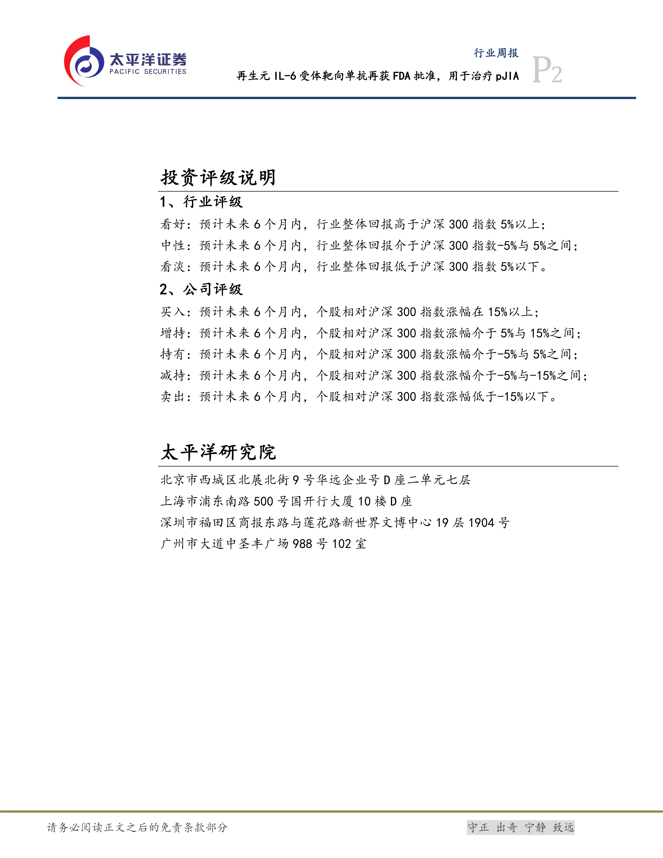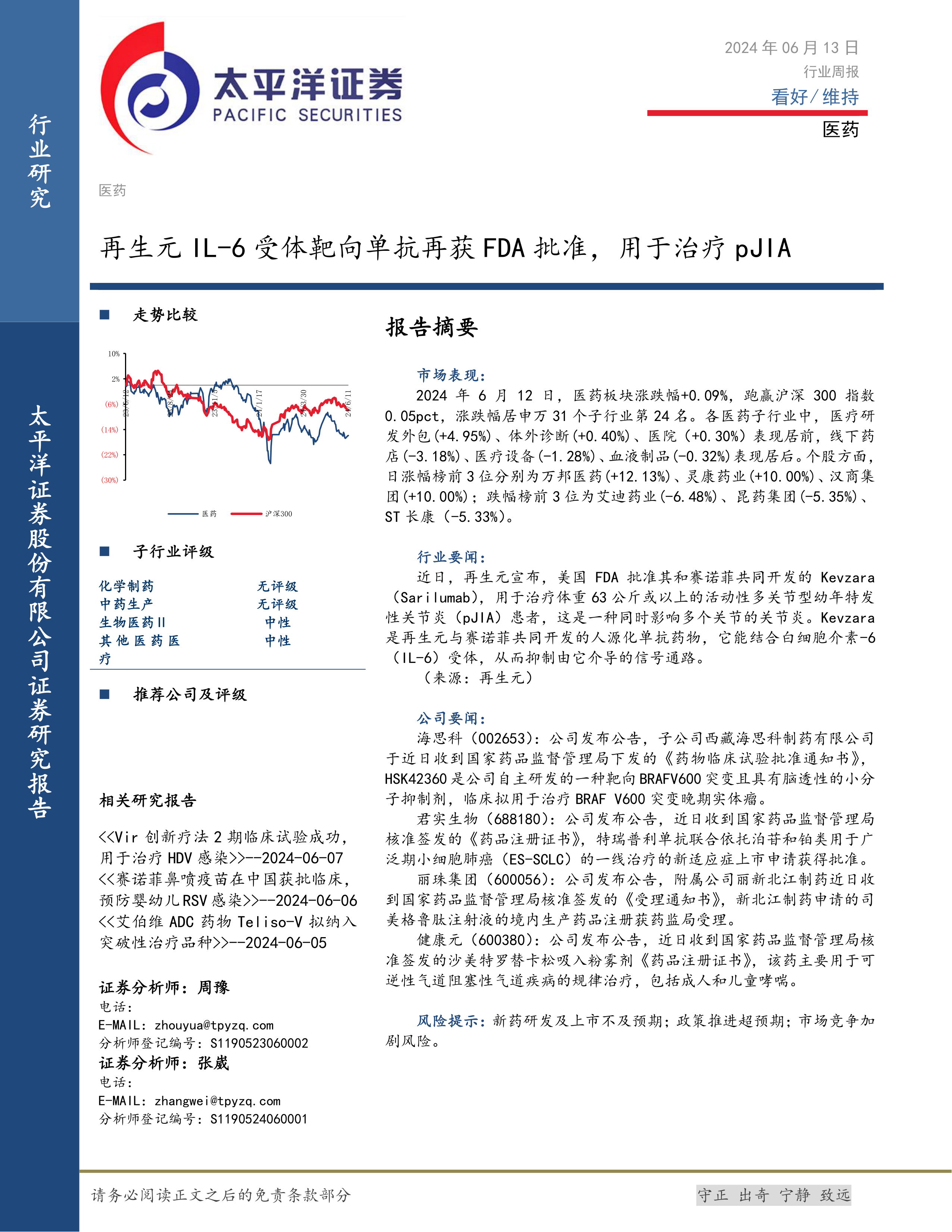 医药行业周报:再生元IL-6受体靶向单抗再获FDA批准,用于治疗pJIA