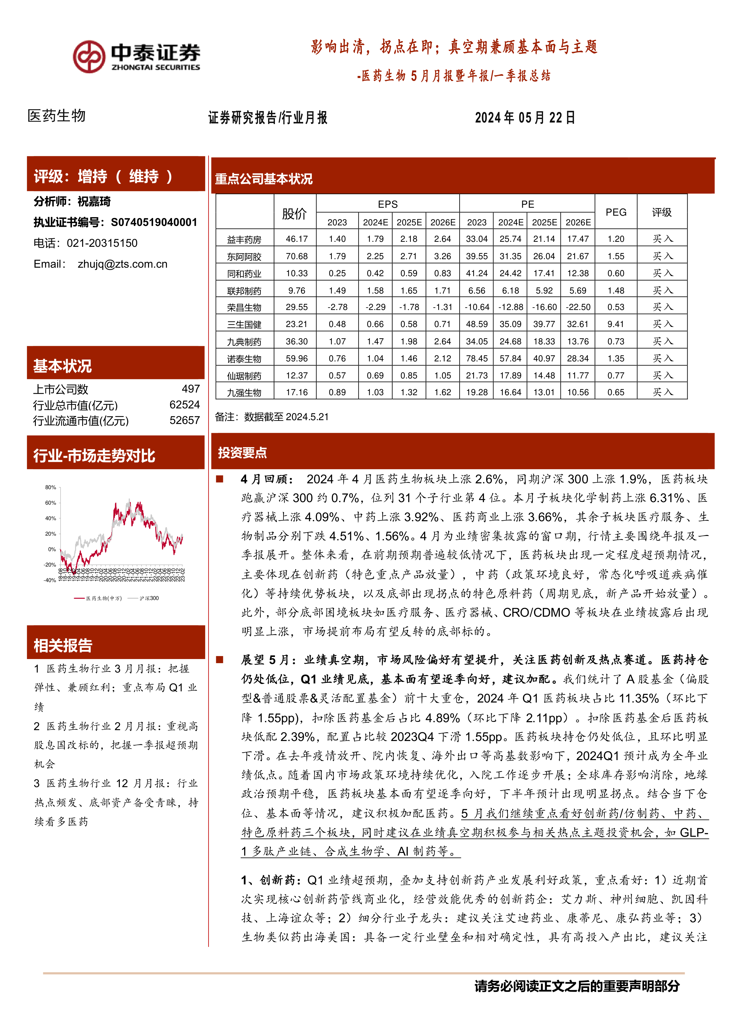 本报告深入分析了医药生物板块在2024年5月的投资观点及2023年报/2024年一季报数据。报告指出,医药板块已完成阶段性筑底,Q1业绩见底,基本面有望逐季向好,下半年预计出现明显拐点。尽管基金持仓仍处低位,但结合政策环境优化和市场风险偏好提升,建议积极加配医药。重点看好创新药/仿制药、中药和特色原料药三大板块,并关注GLP-1多肽产业链、合成生物学、AI制药等热点主题。细分领域中,特色原料药拐点已现,生命科学服务逐步复苏,药店延续稳健。同时,北京、广州、珠海等地出台的创新药支持政策以及ASCO会议的国产新药亮点,均预示着行业创新驱动力的增强。人工关节国采接续政策温和,有利于企业盈利稳定。投资者需关注行业政策扰动和药品质量风险。