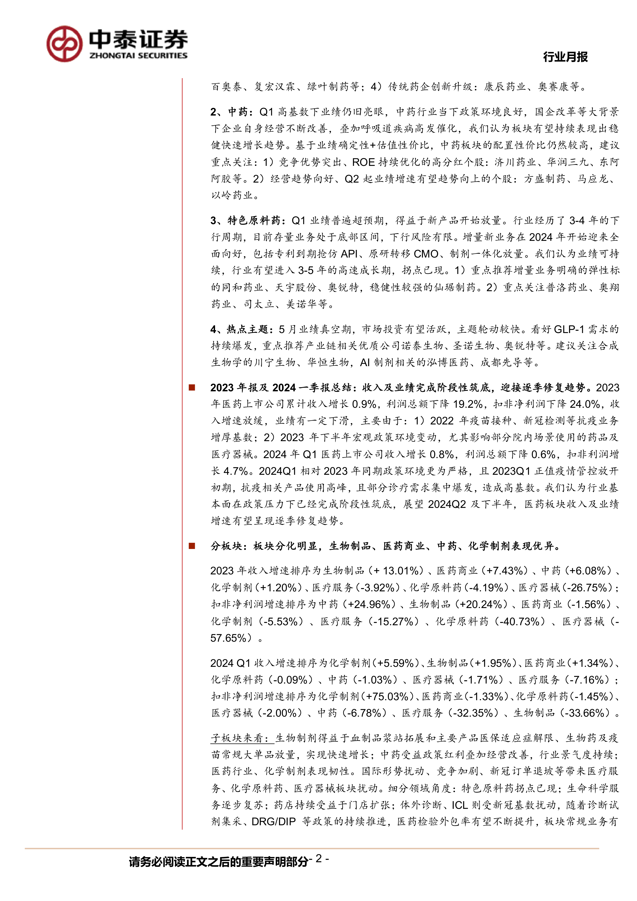 1、创新药:Q1业绩超预期,叠加支持创新药产业发展利好政策,重点看好:1)近期首次实现核心创新药管线商业化,经营效能优秀的创新药企:艾力斯、神州细胞、凯因科技、上海谊众等;2)细分行业子龙头:建议关注艾迪药业、康蒂尼、康弘药业等;3)生物类似药出海美国:具备一定行业壁垒和相对确定性,具有高投入产出比,建议关注百奥泰、复宏汉霖、绿叶制药等;4)传统药企创新升级:康辰药业、奥赛康等。