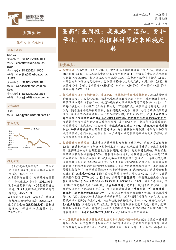 投资策略及配置思路:本周申万医药生物板块指数上升7.5%,跑赢沪深300指数6.6%,医药板块在申万行业分类中排名第1,医药板块已显著反弹,行业关注度提高,医药基金加仓和全基配置意愿逐步提高。受疫情、集采等因素影响,年初以来,医药板块指数跌幅最高超30%,居各行业跌幅前三,非医药基金持仓比例创2018年以来新低;在板块估值底部、配置底部和情绪底部的三重催化下,近期大幅反弹,医药与非医药资金均在积极配置中。随着未来疫情防控预期不断明朗,以医药为代表的大消费板块有望迎来持续的上涨周期,当前为板块战略配置起点,在医保接连释放积极信号下,市场对医药板块关注度逐步增加,有望持续获得非医药资金积极配置:1)三重底部已现:21M7至今已调整1年多,幅度达40%,目前申万医药板块整体估值(TTM法)为23.1倍,持续处于估值底部;非医药主题基金(即全基)对医药持仓已从2020Q2的13.7%降至2022Q2的6.6%,创近5年新低,从近10年维度看也是很底部区域,全基配置底部;受政策、疫情等因素影响下,资金对板块的关注度持续处于底部,整个市场对医药处于情绪底部。2)医保并非一直压制,近期接连释放积极信号:1、医保谈判续约规则清晰可预期,非无止境降价,2、IVD、高值耗材集采规则趋于更科学化,不再强调“唯低价中标”,3、创新药械不纳入DRGs和集采,4、口腔种植服务价格温和,非一刀切,鼓励优质优价;3)疫情防控:国内疫情虽有所散发,但随着防疫政策和抗疫工具包(检测、疫苗、药物和医疗)的完善,国内就诊和消费复苏较为明确。当前我们认为医药仍处于底部震荡区间,值得全基战略性重点配置。我们建议重点方向具体如下: