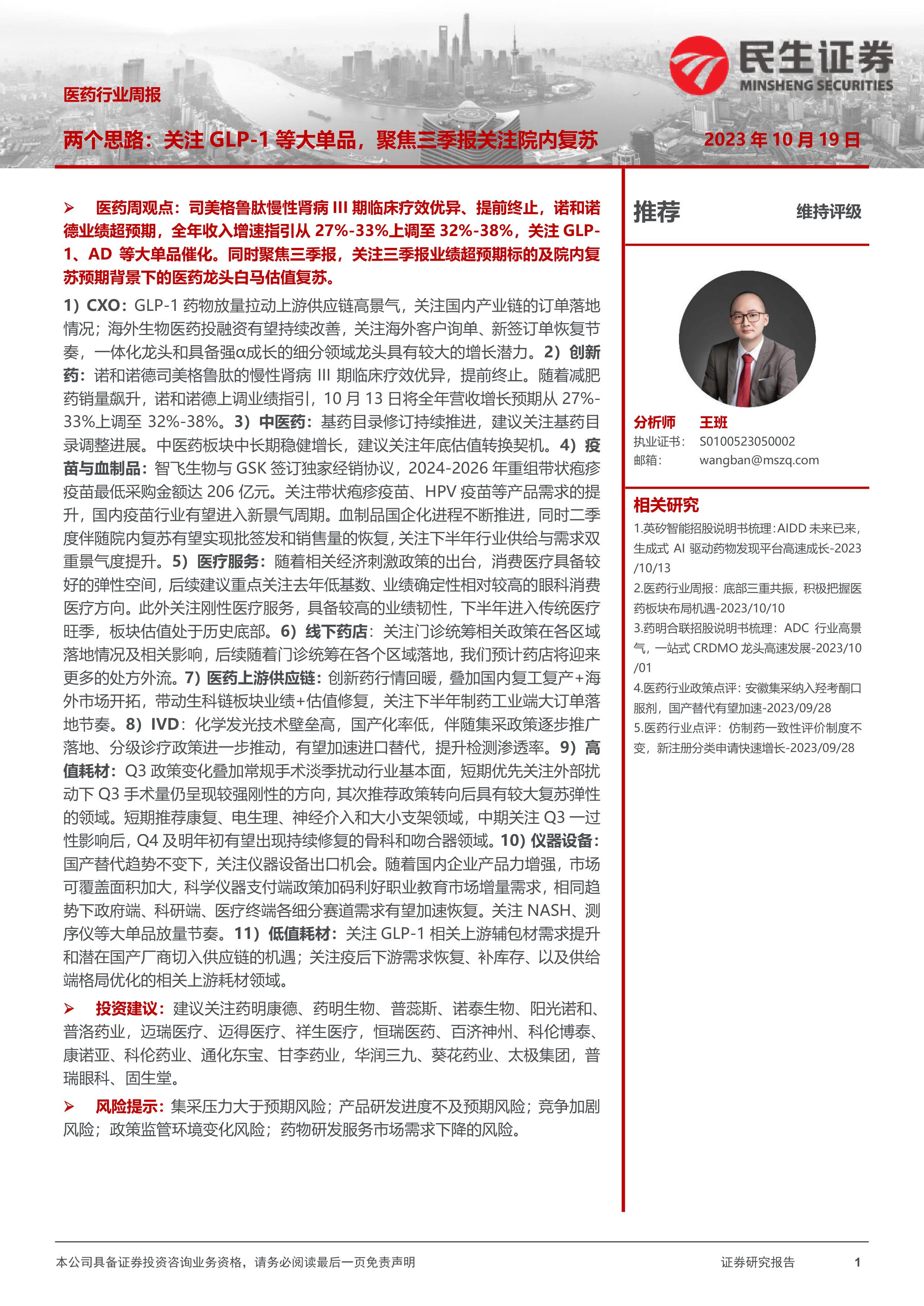 1) CXO: GLP-1 药物放量拉动上游供应链高景气, 关注国内产业链的订单落地情况; 海外生物医药投融资有望持续改善,关注海外客户询单、新签订单恢复节奏,一体化龙头和具备强α成长的细分领域龙头具有较大的增长潜力。 2)创新药: 诺和诺德司美格鲁肽的慢性肾病 III 期临床疗效优异,提前终止。随着减肥药销量飙升, 诺和诺德上调业绩指引, 10 月 13 日将全年营收增长预期从 27%-33%上调至 32%-38%。 3)中医药: 基药目录修订持续推进,建议关注基药目录调整进展。中医药板块中长期稳健增长,建议关注年底估值转换契机。 4)疫苗与血制品: 智飞生物与 GSK 签订独家经销协议, 2024-2026 年重组带状疱疹疫苗最低采购金额达 206 亿元。关注带状疱疹疫苗、 HPV 疫苗等产品需求的提升,国内疫苗行业有望进入新景气周期。血制品国企化进程不断推进,同时二季度伴随院内复苏有望实现批签发和销售量的恢复,关注下半年行业供给与需求双重景气度提升。 5)医疗服务: 随着相关经济刺激政策的出台, 消费医疗具备较好的弹性空间,后续建议重点关注去年低基数、业绩确定性相对较高的眼科消费医疗方向。此外关注刚性医疗服务,具备较高的业绩韧性,下半年进入传统医疗旺季, 板块估值处于历史底部。 6)线下药店: 关注门诊统筹相关政策在各区域落地情况及相关影响,后续随着门诊统筹在各个区域落地,我们预计药店将迎来更多的处方外流。 7)医药上游供应链: 创新药行情回暖,叠加国内复工复产+海外市场开拓,带动生科链板块业绩+估值修复,关注下半年制药工业端大订单落地节奏。 8) IVD:化学发光技术壁垒高,国产化率低,伴随集采政策逐步推广落地、分级诊疗政策进一步推动,有望加速进口替代,提升检测渗透率。 9) 高值耗材: Q3 政策变化叠加常规手术淡季扰动行业基本面,短期优先关注外部扰动下 Q3 手术量仍呈现较强刚性的方向,其次推荐政策转向后具有较大复苏弹性的领域。短期推荐康复、电生理、神经介入和大小支架领域, 中期关注 Q3 一过性影响后, Q4 及明年初有望出现持续修复的骨科和吻合器领域。 10) 仪器设备:国产替代趋势不变下,关注仪器设备出口机会。随着国内企业产品力增强,市场可覆盖面积加大,科学仪器支付端政策加码利好职业教育市场增量需求,相同趋势下政府端、科研端、医疗终端各细分赛道需求有望加速恢复。关注 NASH、测序仪等大单品放量节奏。 11) 低值耗材: 关注 GLP-1 相关上游辅包材需求提升和潜在国产厂商切入供应链的机遇;关注疫后下游需求恢复、补库存、以及供给端格局优化的相关上游耗材领域。