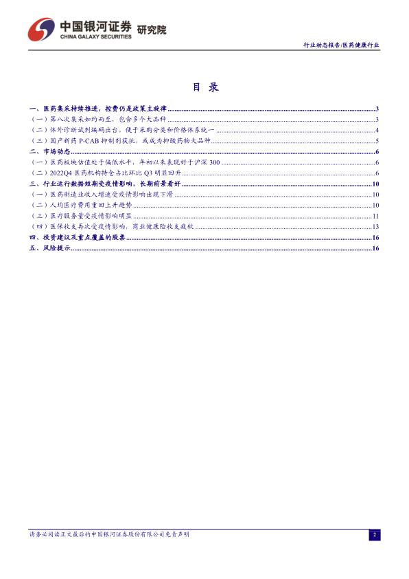 市场方面,医药板块估值目前处于历史偏低水平,且年初以来表现优于大盘,机构持仓占比在2022年第四季度显著回升,显示出市场对医药行业的信心正在恢复。尽管短期内疫情对医药制造业收入增速、医疗服务量以及医保和商业健康险收支造成了负面影响,但人均医疗费用长期上升的趋势未变,表明医疗需求具有内在韧性。