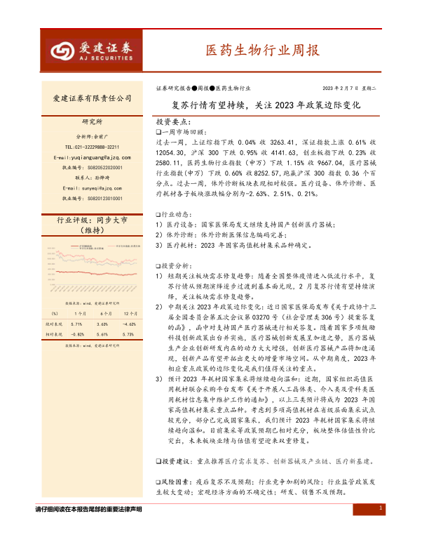 本周报对医药生物行业进行了全面的分析,指出在疫情影响逐渐减弱的背景下,行业正迎来复苏机遇。短期内,板块需求修复是关键;中期来看,政策的边际变化将深刻影响行业发展,尤其是对国产医疗器械的扶持和创新医疗器械的审批加速。此外,集采政策的温和化趋势,为企业提供了更大的发展空间。