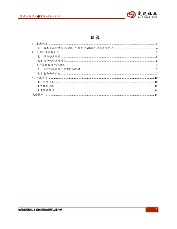 报告建议重点关注医疗需求复苏、创新器械及产业链、医疗新基建等领域。同时,报告也提示了疫后复苏不及预期、行业竞争加剧、行业监管政策变动、宏观经济不确定性以及研发销售不及预期等风险因素。