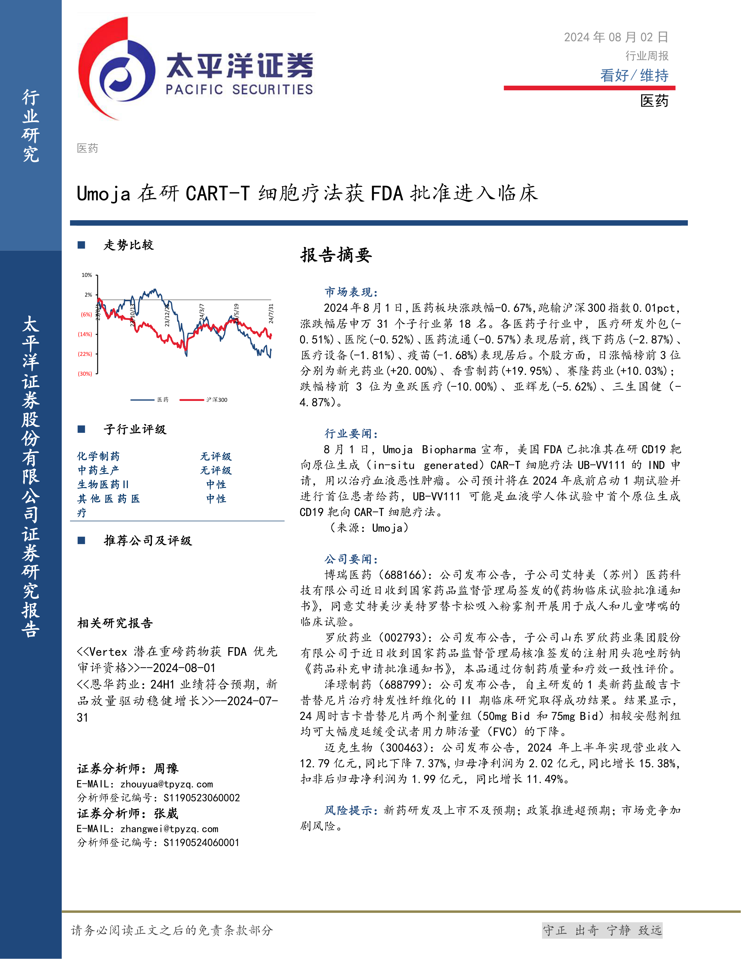 本周医药行业整体表现不佳,但行业内部存在结构性机会。Umoja的CAR-T疗法获批临床等行业动态值得关注,相关公司的研发进展和业绩表现将影响未来的投资机会。投资者应关注创新药研发、业绩增长稳健的公司。