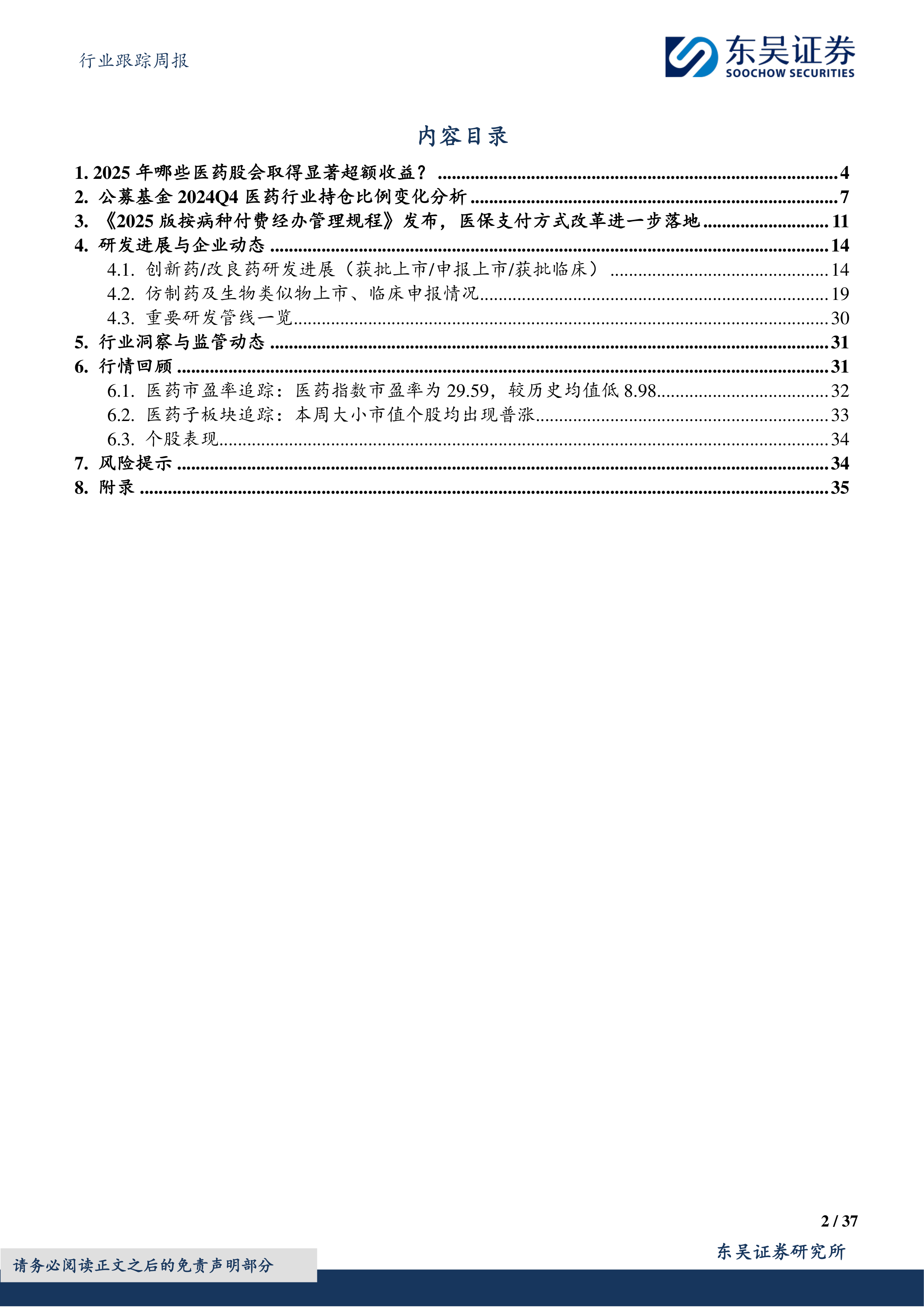 2025年医药板块能否具有超额收益?截至目前医药板块跌幅约3.8%、处于中位数位置,医药板块仍有望走出显著超额的原因为:1、仿制药及类似物采集影响边际减弱。2024年针对中药、耗材及第十批集采落地,集采影响全部扩面,但2025年500个品种的集采目标进入尾声。另外1月27日医保局印发《按病种付费医疗保障经办管理规程》,重点强调加强按病种付费与医疗服务价格改革、集采、国谈等协同,同时做好即时结算等方面内容。2、医疗商业保险很可能催化创新药大行业。医保局积极推动丙类目录征求意见很可能一季度落地,有助于商保大发展。3、Q4持仓结构再创新低。医药板块4年连续下跌,其占全A比例从2021年的10%下降至今6%、非医药公募基金Q4医药持仓估计约5%,市值增加最多的为人福医药、药明康德、贝达药业、联影医疗、昆药集团等。4、医药估值水平颇具吸引力。我们预测2025年医药板块PE约21倍,其中医药行业、中药、医疗器械估值分别为11倍、17倍、20倍,处于较低水平。综上分析,重点推荐创新药、中药、CXO及医疗器械等板块。