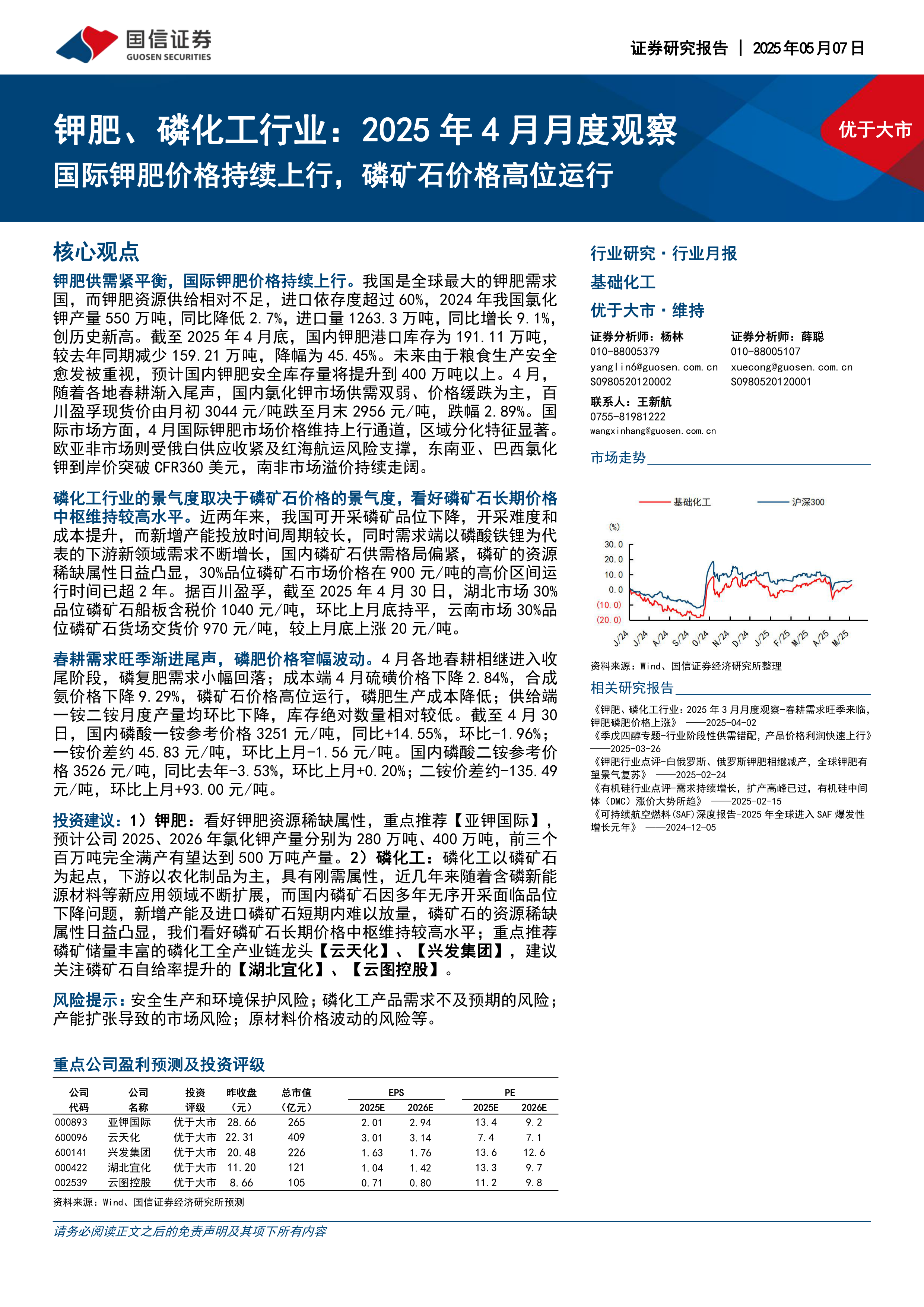 钾肥、磷化工行业:2025年4月月度观察:国际钾肥价格持续上行,磷矿石价格高位运行
